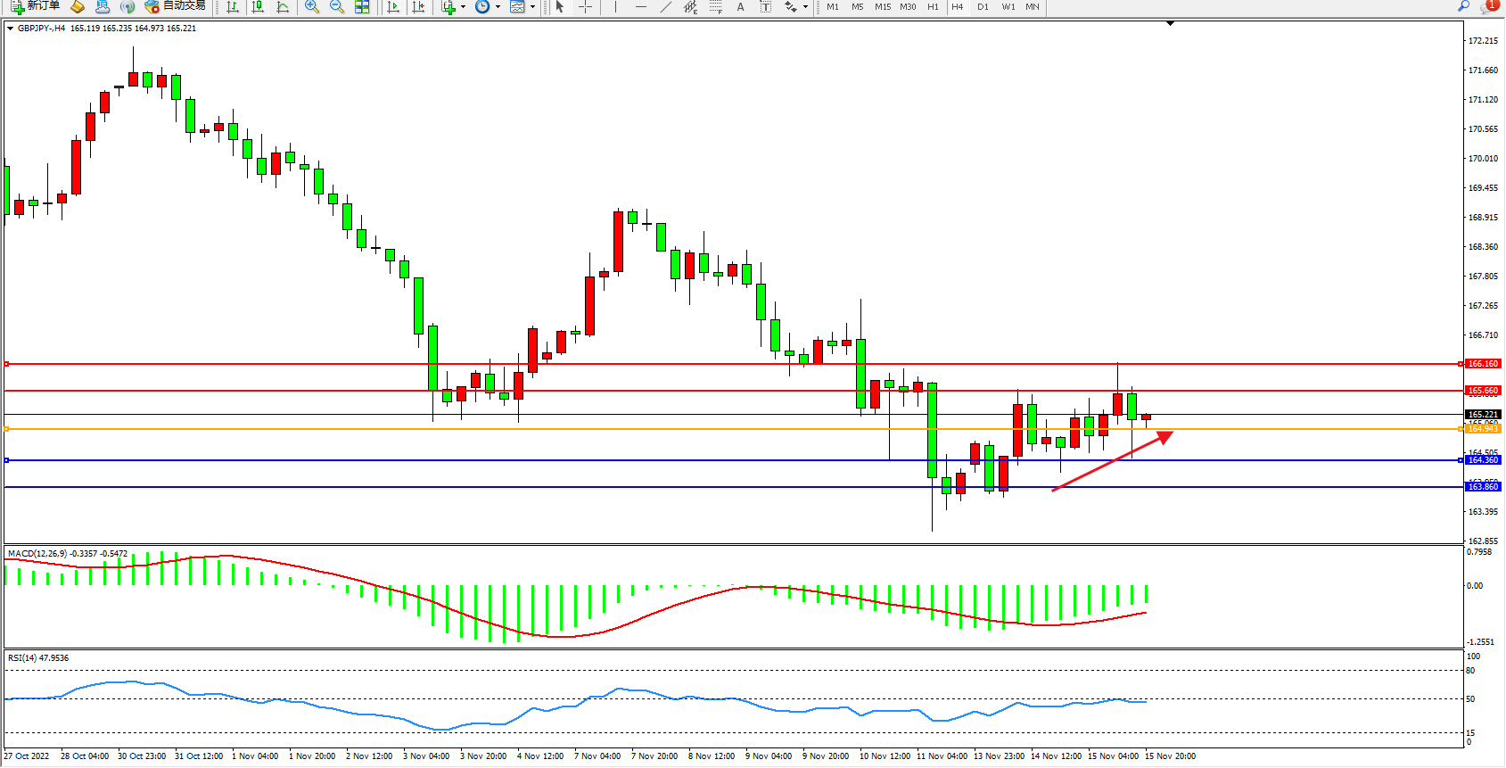 交易策略:165.154上方看涨,目标165.660、166.160