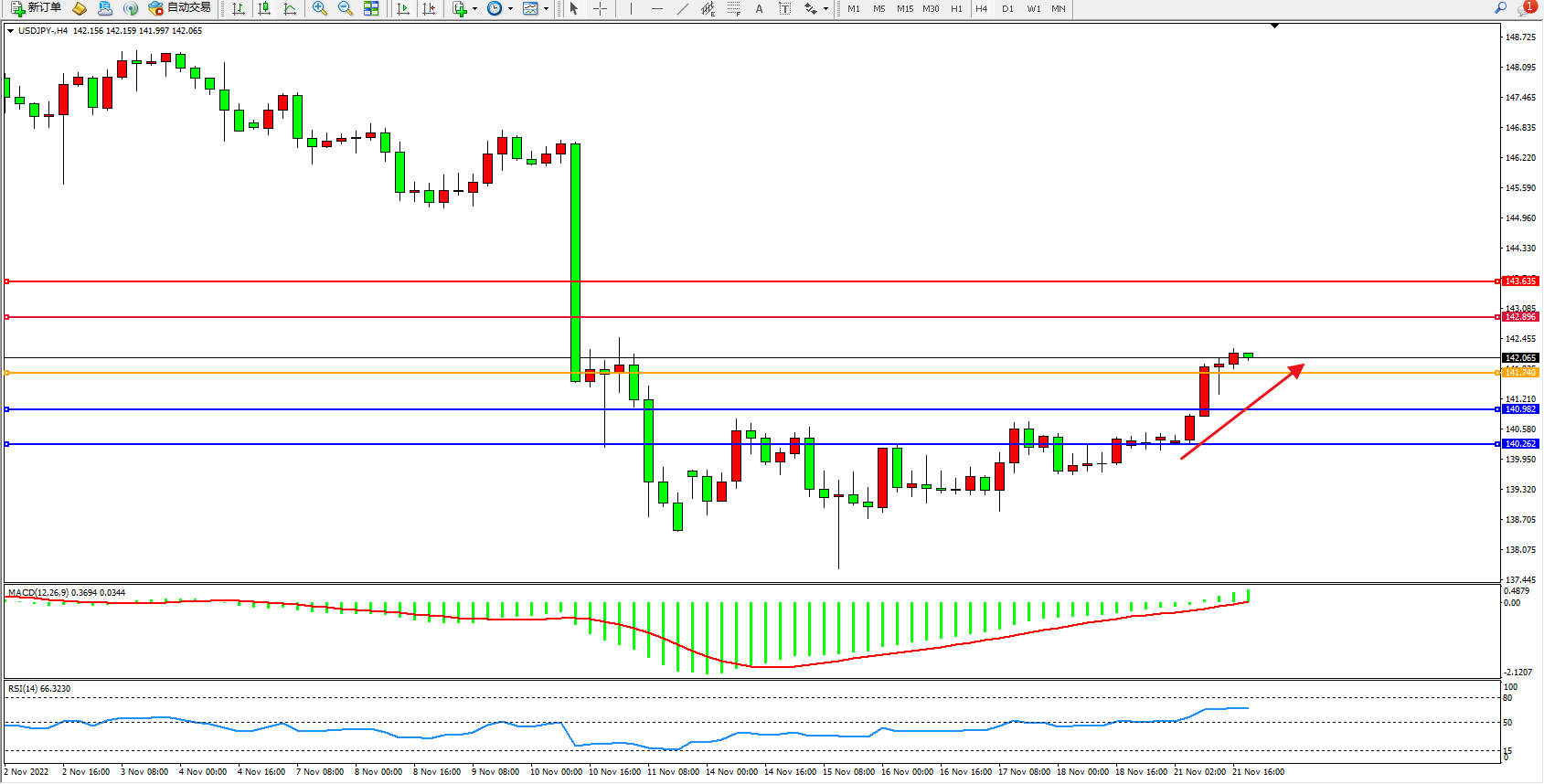 4小时图看:低位多头动力维持震荡缓慢上移,市场多头潜力发酵,开始逐步上扬,MACD指标处于0轴线上側徘徊,RSI指标处于50均衡线上側弱势整理中;