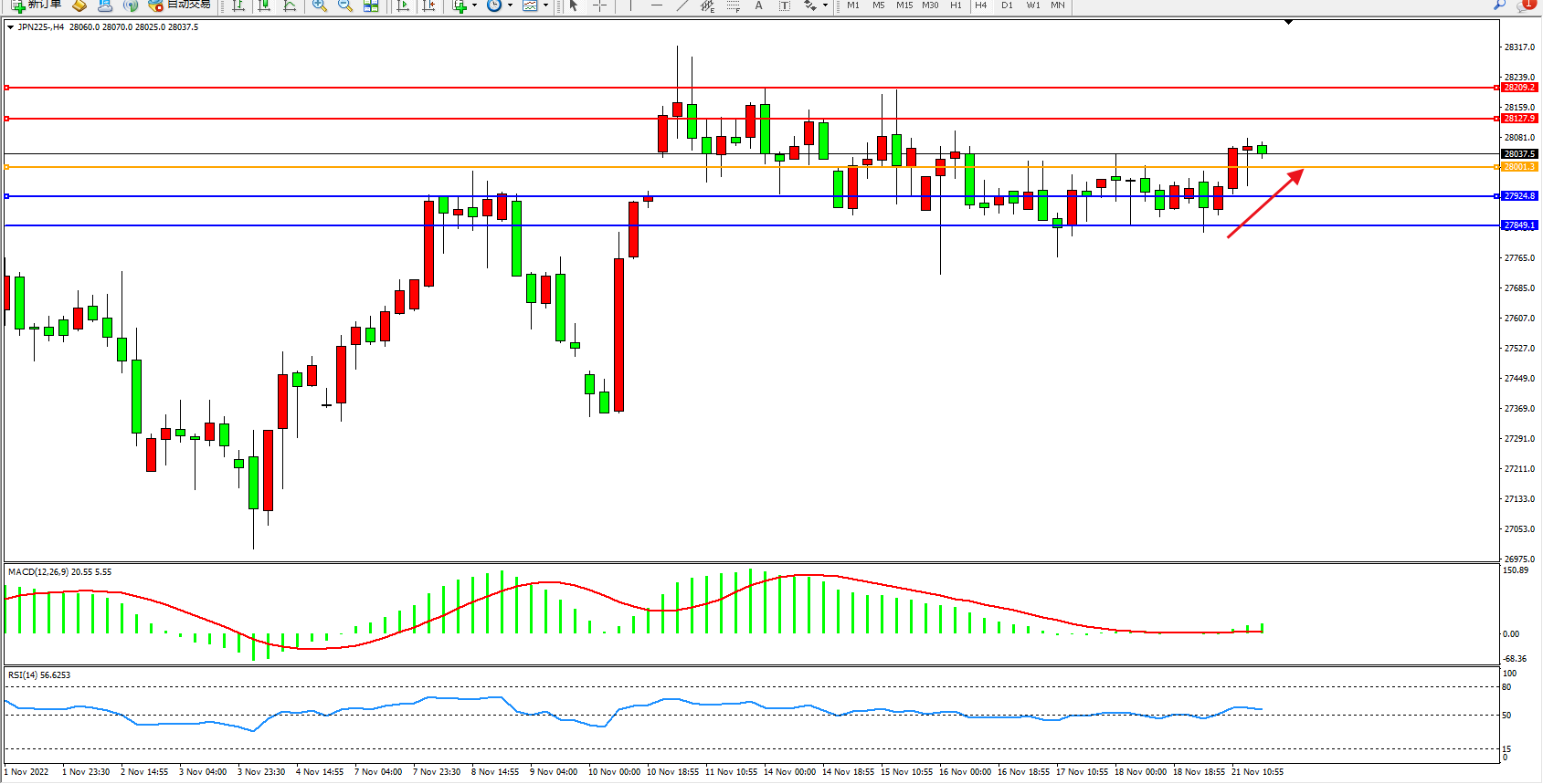 日经225指数11月21日(周一)收盘上涨34.73点,涨幅0.12%,报27934.50点。日本政府当天向国会提交了一般会计总额约为28.9万亿日元的2022财年第二次补充预算案。相关款项将用于应对物价高涨等经济对策。