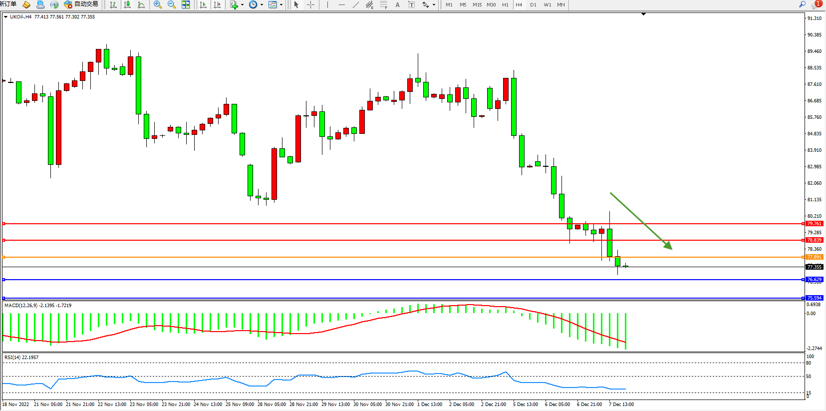 交易策略:77.891下方看跌,目标76.629、75.594