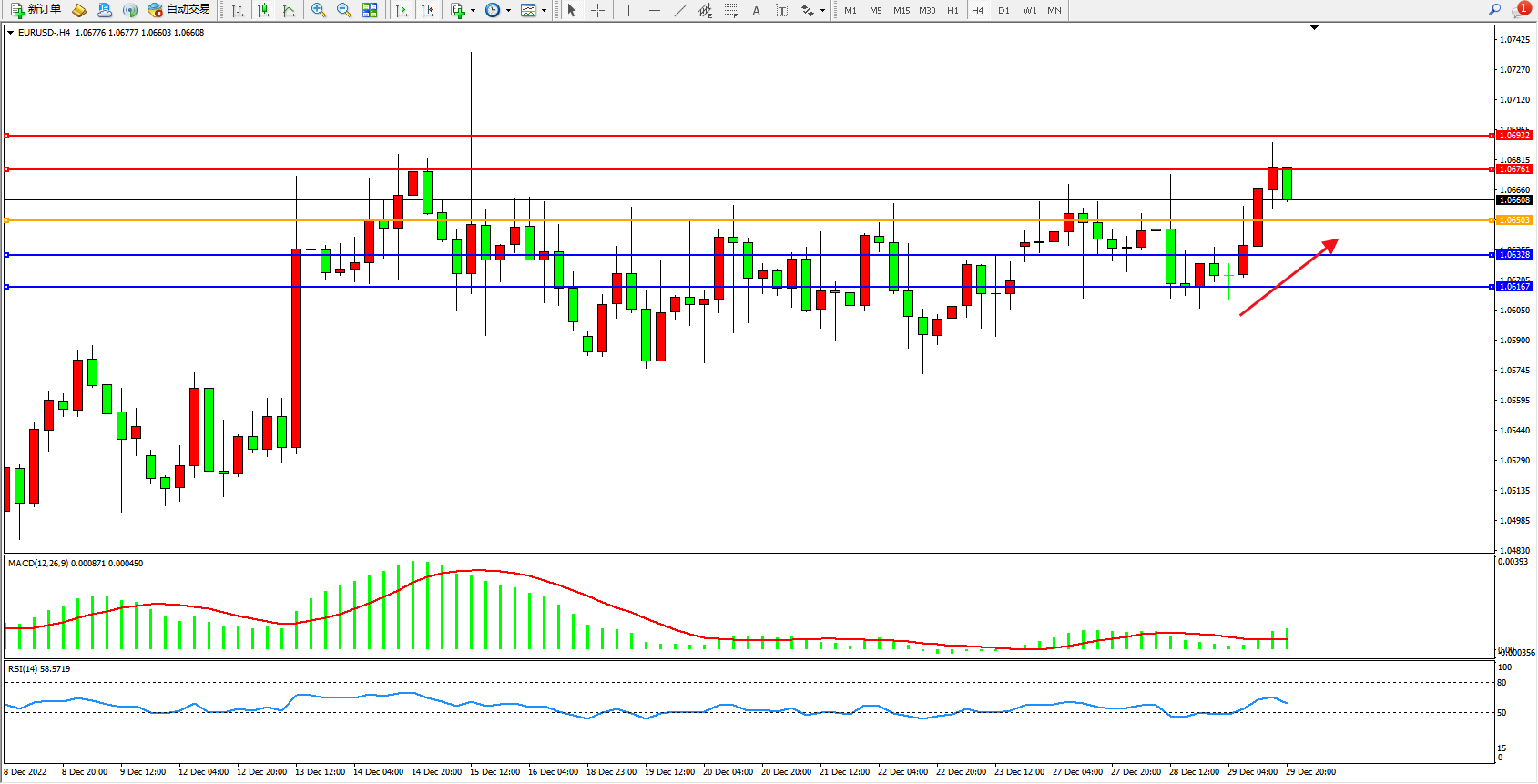 欧元美元EURUSD—4小时K线图显示: