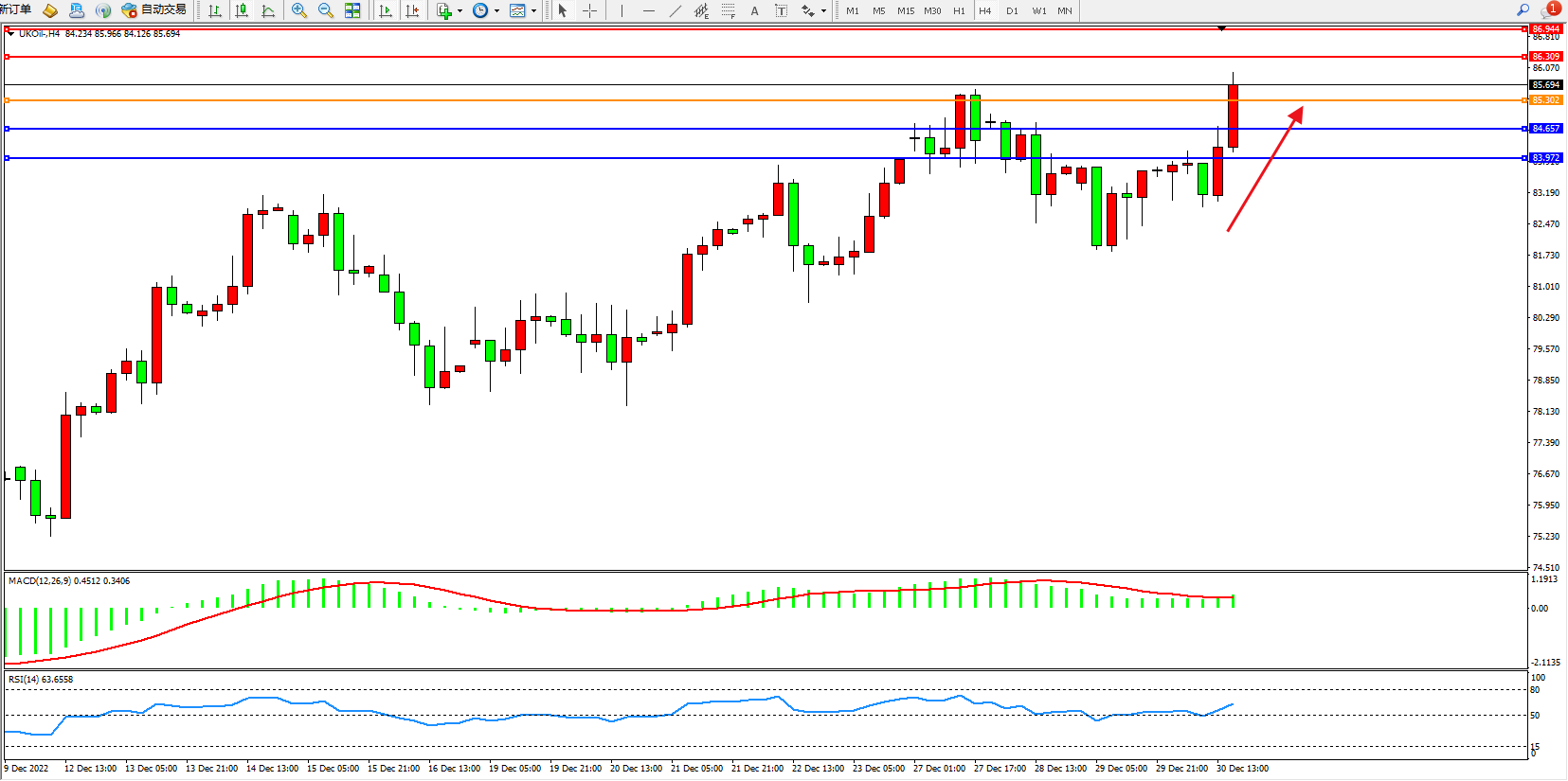 布油维持85.694附近震荡,受今年2月份俄乌局势影响,油价前两季度呈上升趋势,最高至138.02美元/桶,后两季度逐渐回落,一度抹平年内涨幅,触底反弹后,布油全年累涨0.10%。