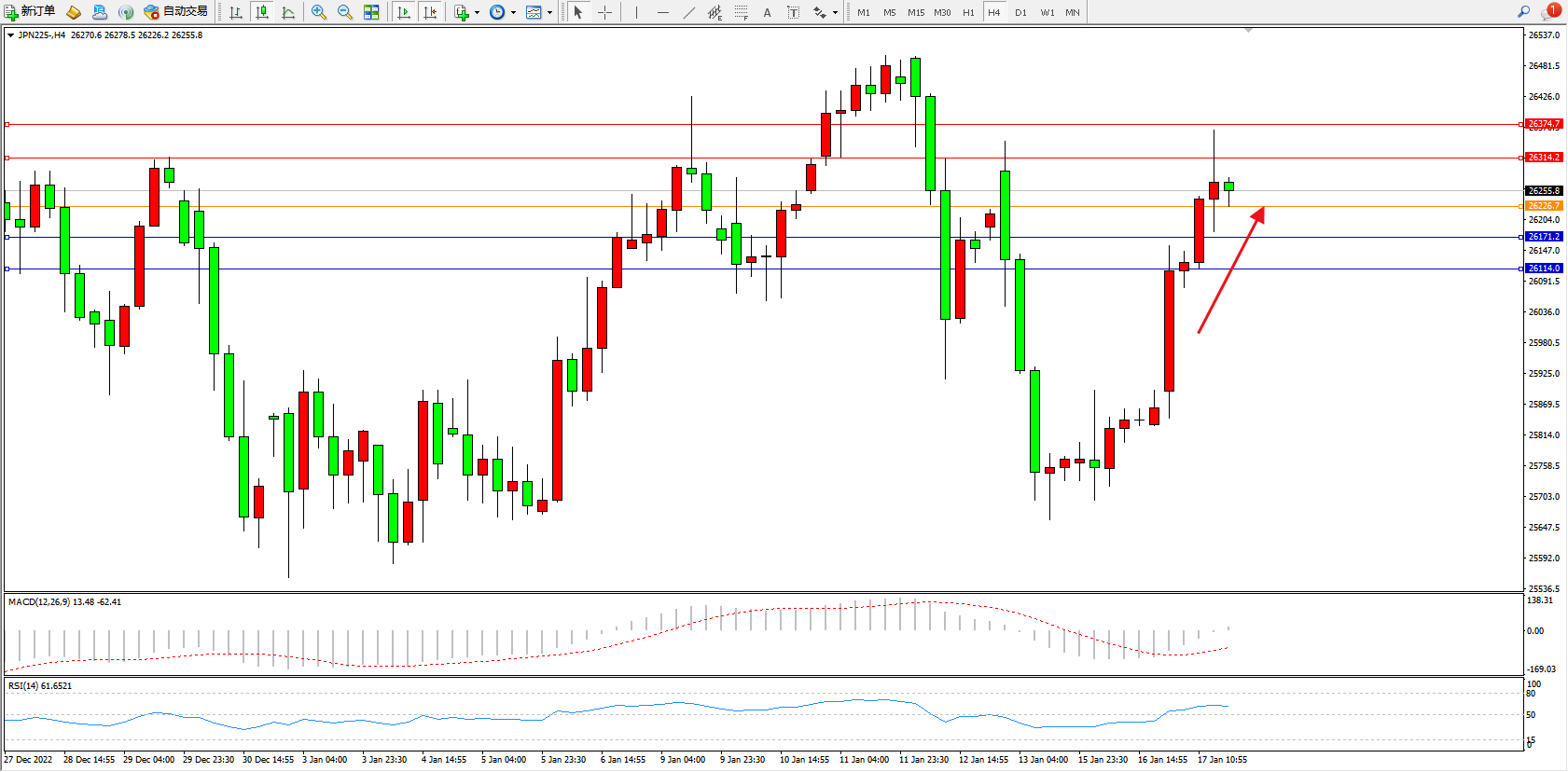 日经225指数1月17日(周二)收盘上涨302.68点,涨幅1.17%,报26125.00点。日本立宪民主党、日本维新会、日本共产党、日本国民民主党、日本令和新选组等在野党派的国会对策委员长当天傍晚进行会谈,就反对政府“为防卫费增税”一事达成一致意见。他们一致认为,23日日本国会召开后,应进行充分讨论,反对轻易增税。