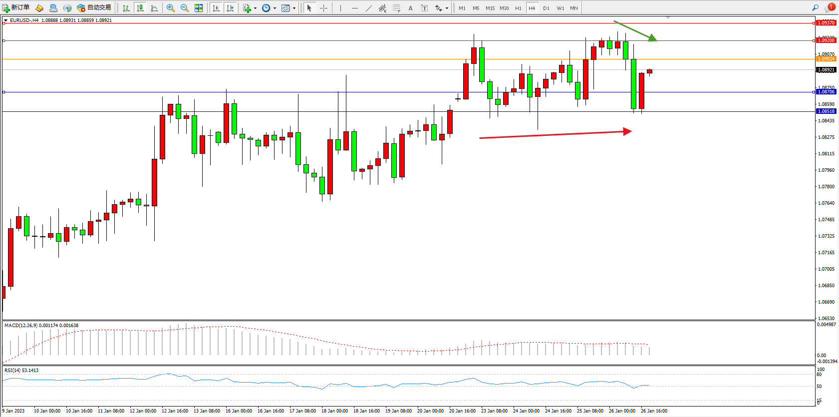 欧元美元EURUSD—4小时K线图显示: