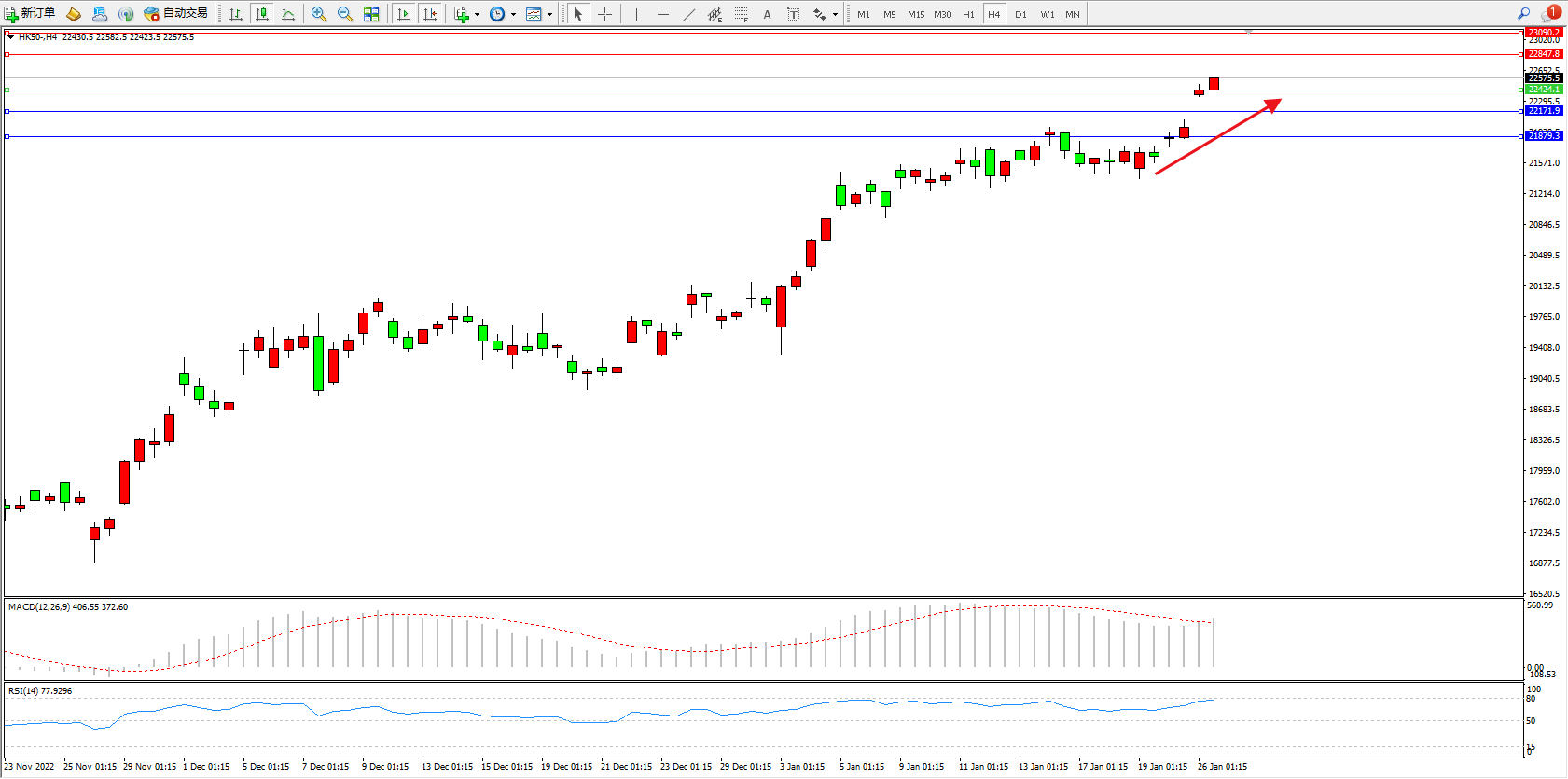 香港恒生指数1月26日(周四)收盘上涨522.13点,涨幅2.37%,报22566.78点;港股兔年第一个交易日恰逢正月初五喜迎“财神”,板块百花齐放全线上涨,投资者扬眉“兔”气尽享“红包行情”。港股主要指数今日高开高走,午后涨幅扩大并于尾盘进一步拉升。恒生科技指数涨4.26%、国指涨2.98%站上7700点,二者均创去年7月以来新高;恒指涨2.37%报收22566点,创去年3月以来约11个月新高。
