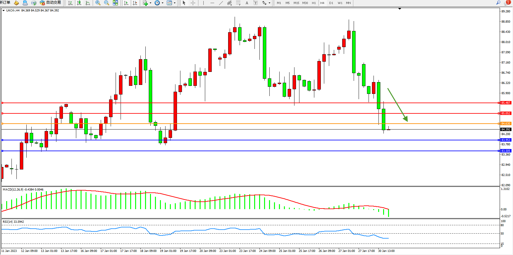 4小时图看:空头动力持续震荡下挫,短期跌势未见止步,市场空头情绪笼罩,有继续向下移动态势,MACD指标处于空头区域向下移动,RSI指标处于空头区域整理;