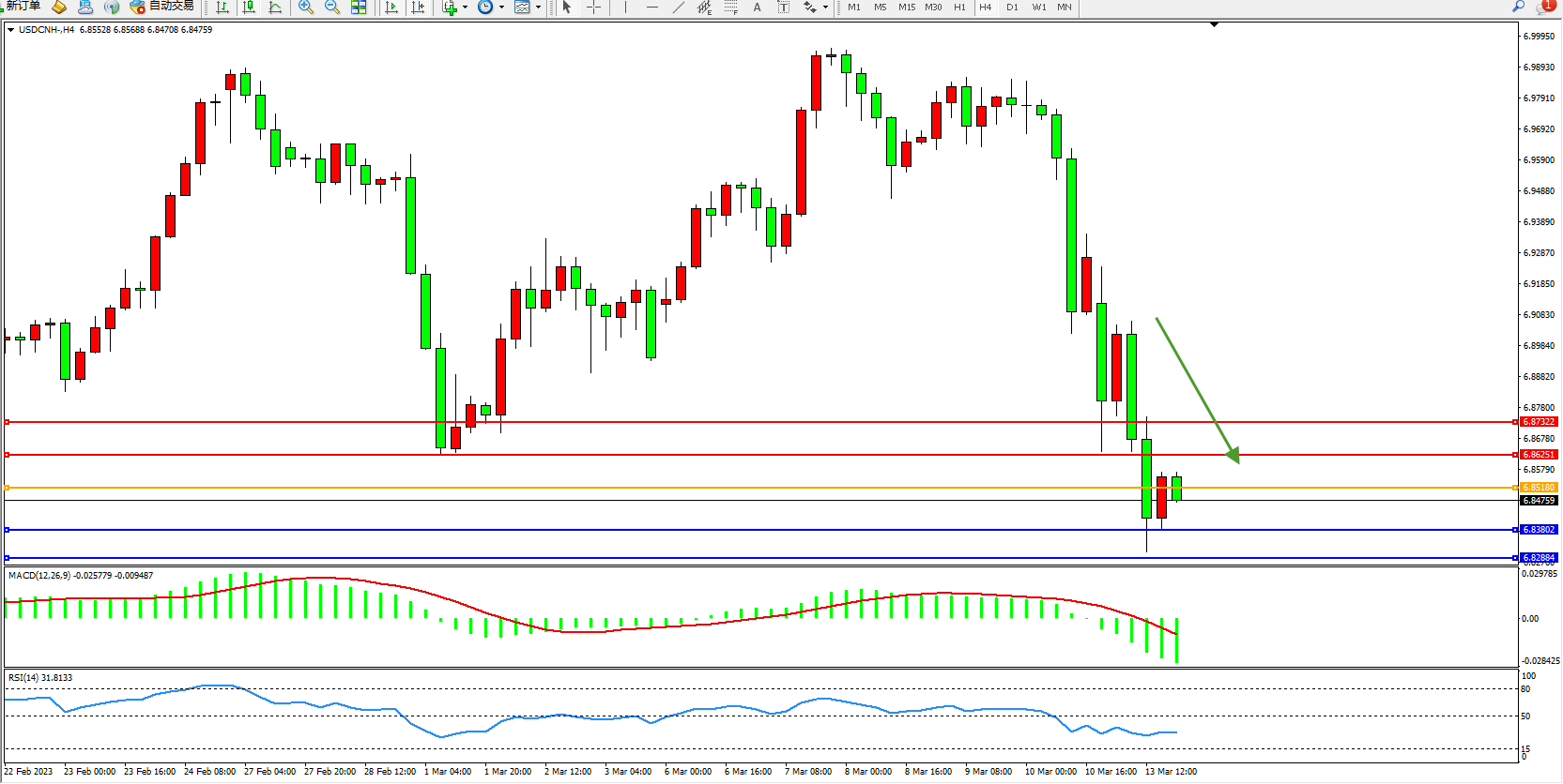 美元人民币USDCNH——4小时K线图显示: