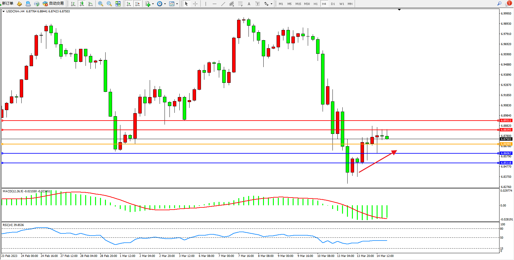 备选策略:6.86985上方看涨,目标6.88393  6.89311