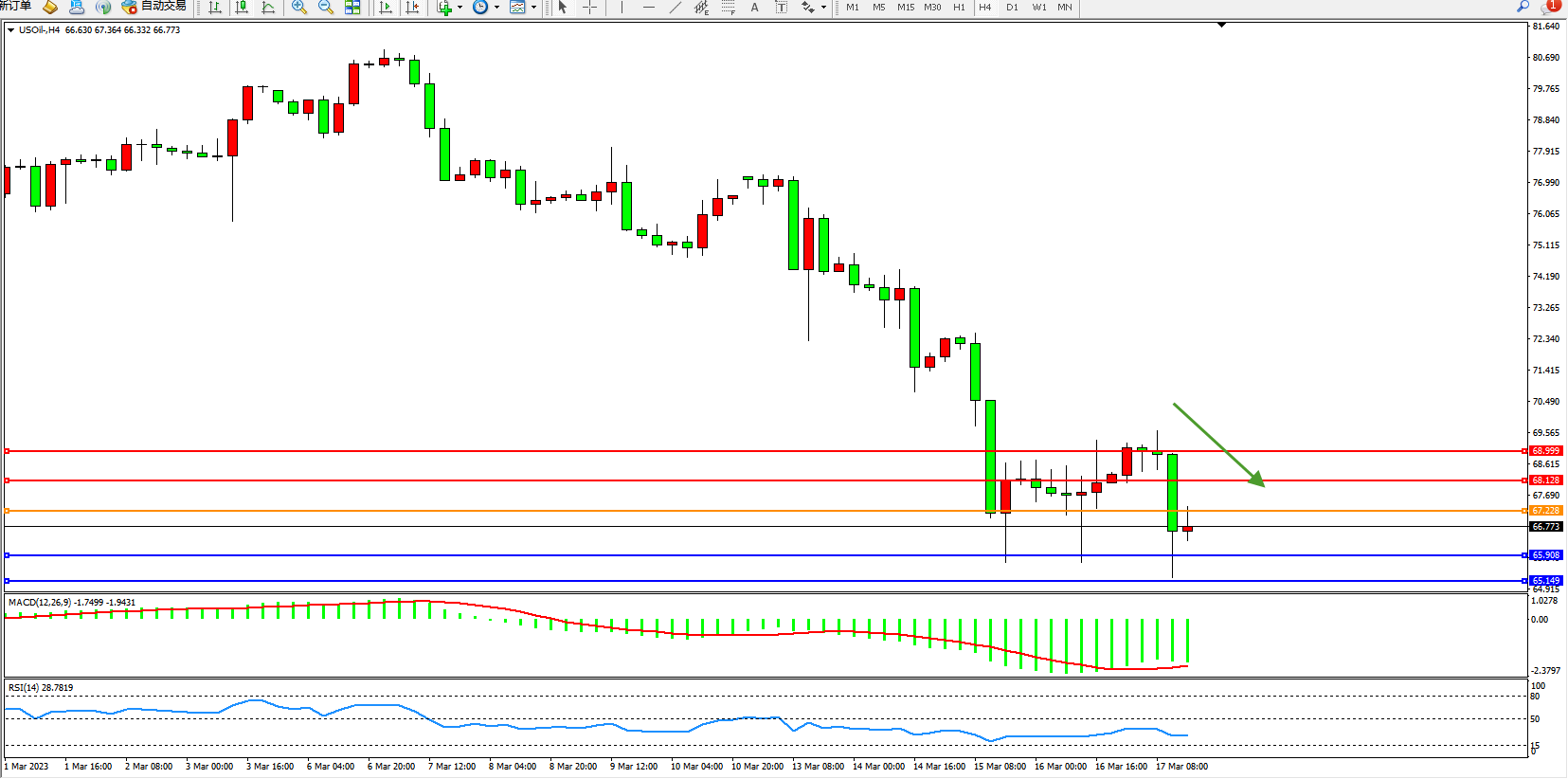 4小时图看:空头动力低位震荡后急速下挫,短期跌势或将持续,市场整体处于空头不断下移中,MACD指标处于空头区域低位整理,RSI指标处于空头区域弱势徘徊;