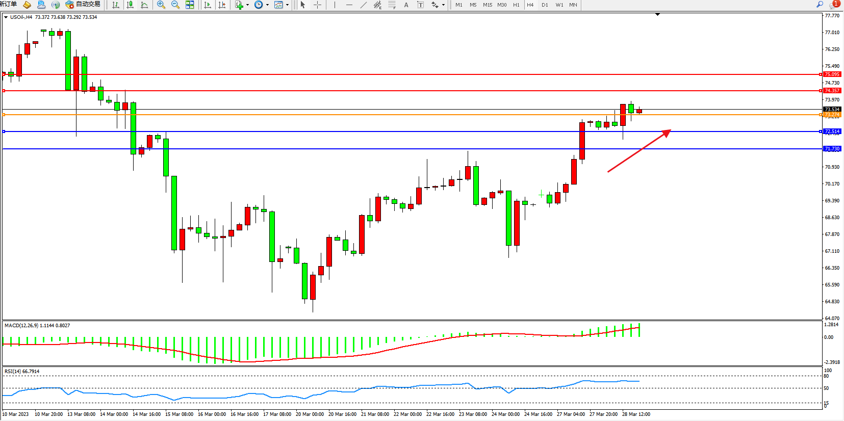 原油维持73.534附近震荡,国际油价在刷新两周高位后展开盘整,尽管银行业危机暂时平息且伊拉克北部供应中断支撑油价,但俄罗斯重置因西方制裁而影响的石油出口,这放慢了油价升势;