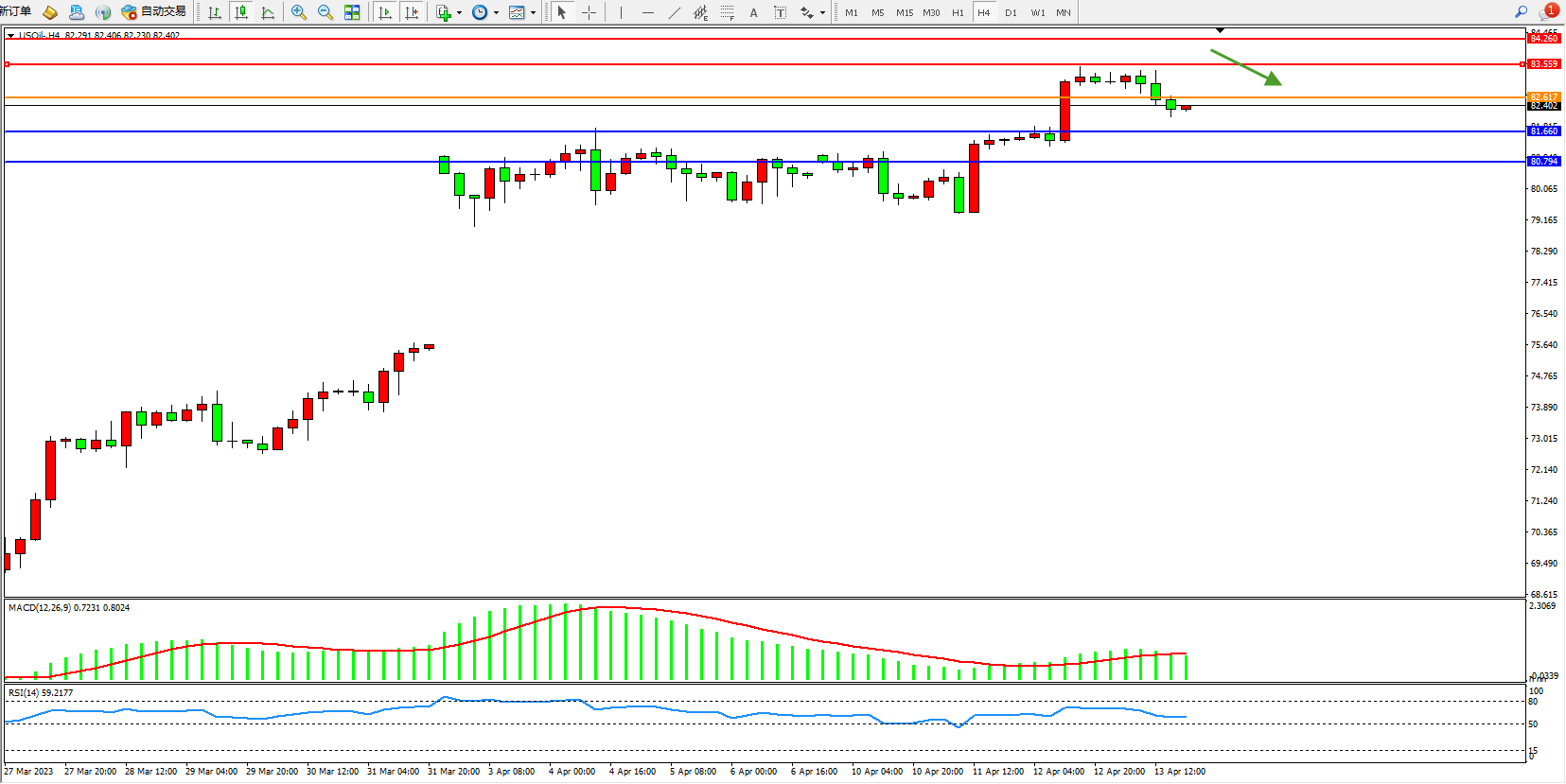 原油USOil——4小时K线图显示: