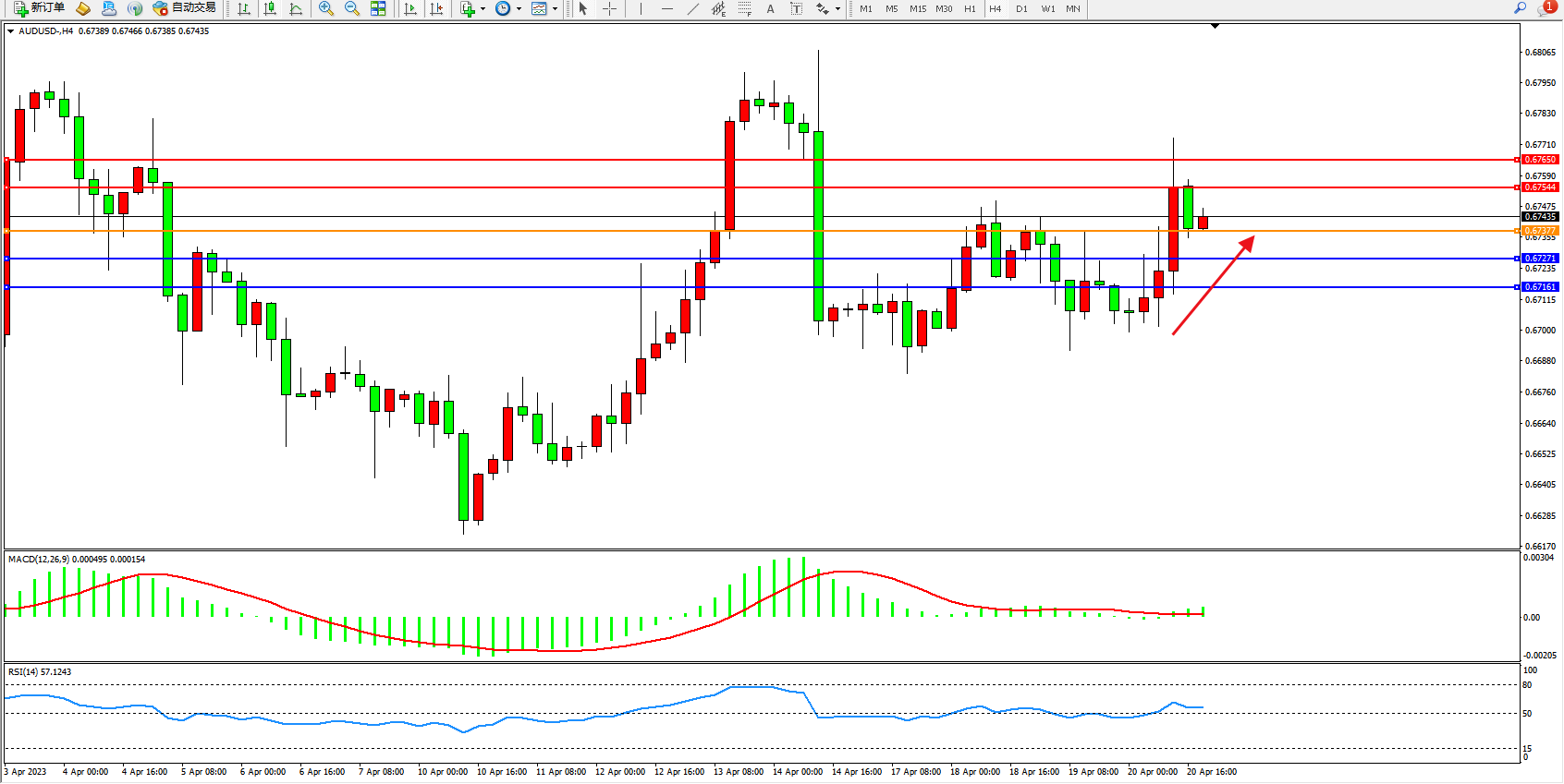 4小时图看:短期多头动力维持震荡上扬后整理,市场多头趋势开始有所减弱,MACD指标处于0轴线附近弱势徘徊,RSI指标处于50均衡线上側徘徊;