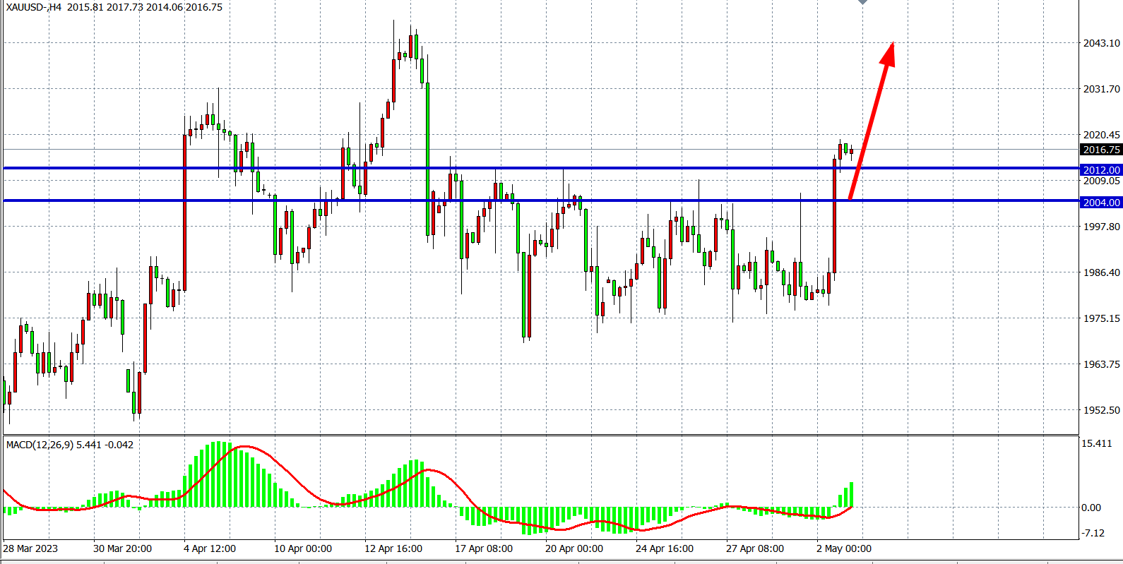 周二(5月2日)在美联储利率决议前夕,公布的数据显示,3月JOLTS职位空缺959万人,降幅超预期且创近两年最低,显示就业市场进一步降温,可能有助于减轻通胀压力。受此影响,美指美债收益率大幅下行,现货黄金受益于美国银行业危机和美债上限问题带来的避险需求提升,盘中一度上逼2020美元,最终收涨1.72%。