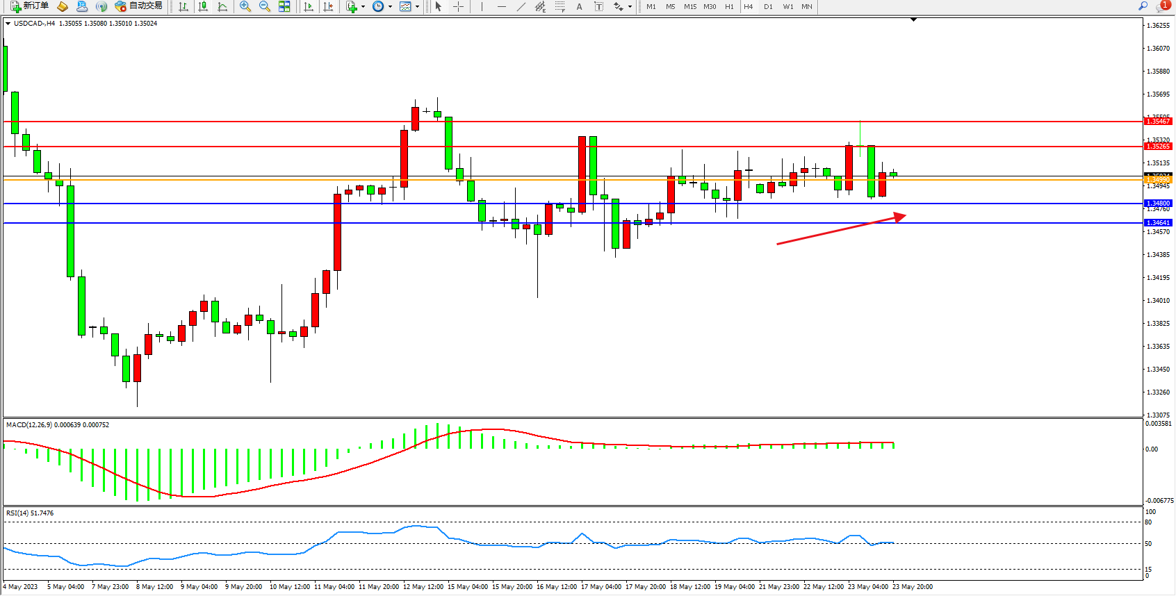 4小时图看:短期维持区间震荡平移,市场整体处于偏多头走势中,短期或纠结区间震荡走势,MACD指标处于0轴线上側弱势徘徊,RSI指标处于50均衡线附近弱势整理;