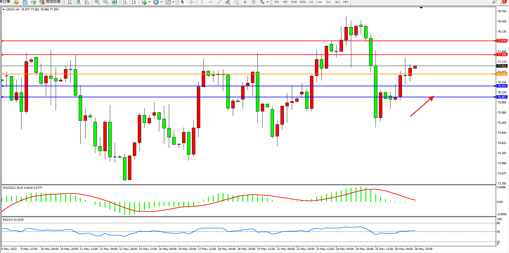 交易策略:77.054上方看涨,目标77.396 77.830