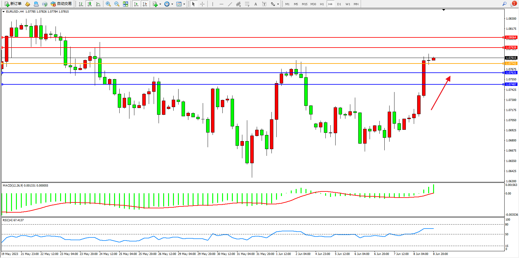 欧元美元EURUSD—4小时K线图显示: