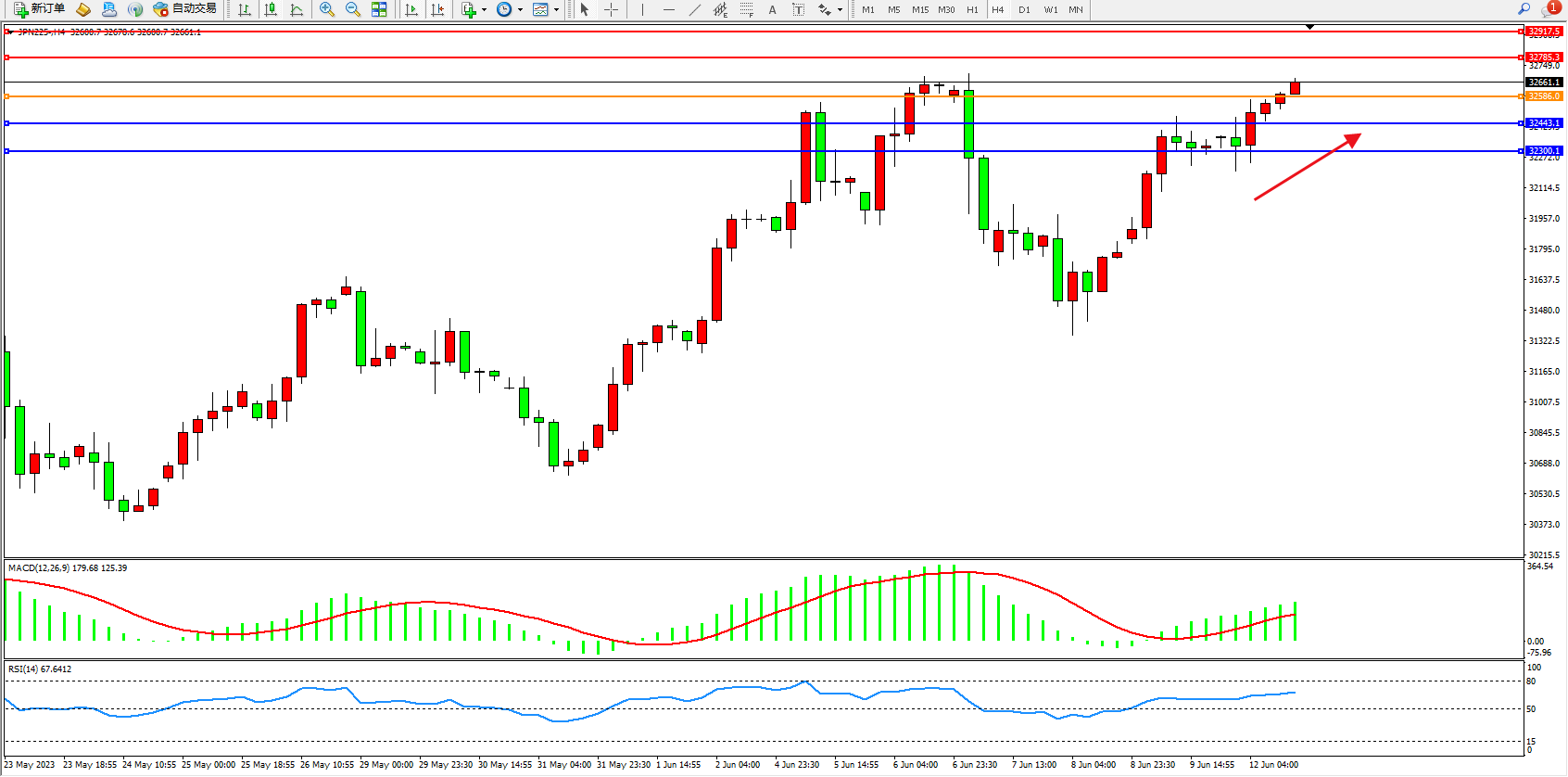 日经225指数6月12日(周一)收盘上涨197.33点,涨幅0.61%,报32462.50点。日本央行官员认为,由于日本债券市场的运作有所改善,日本央行在会议上对收益率的控制几乎没有必要改变。