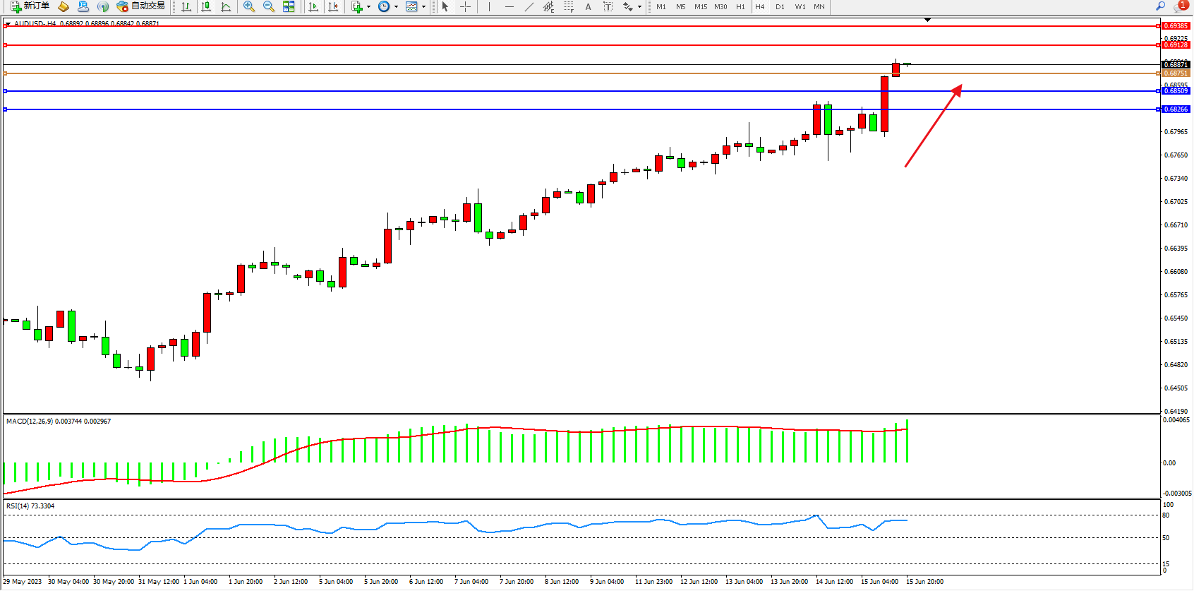 澳元兑美元维持0.68871附近震荡,澳洲5月就业人口增幅超预期,同时失业率小幅下降,就业参与率升至历史新高,这份异常强劲的就业报告将给央行进一步加息带来压力。
