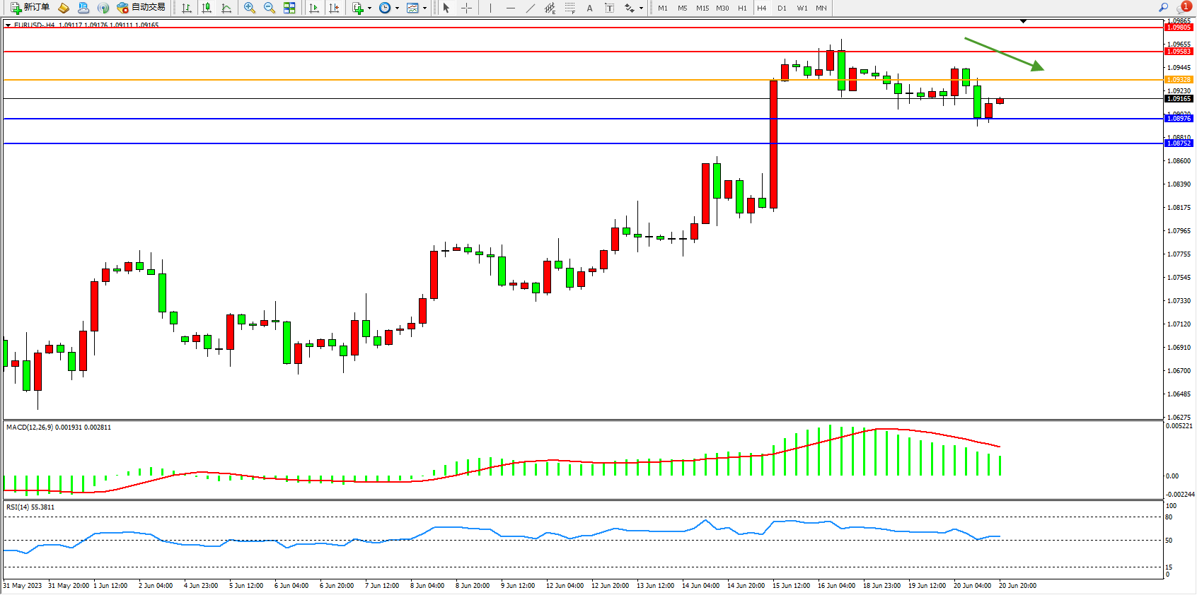 欧元美元EURUSD—4小时K线图显示: