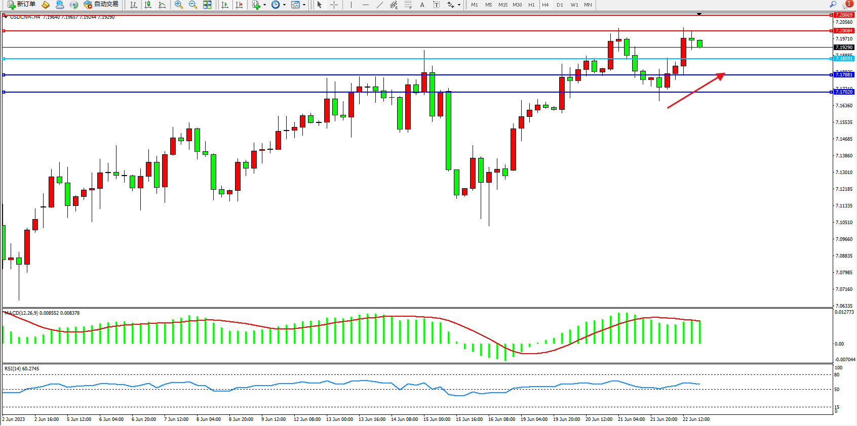 美元人民币USDCNH——4小时K线图显示: