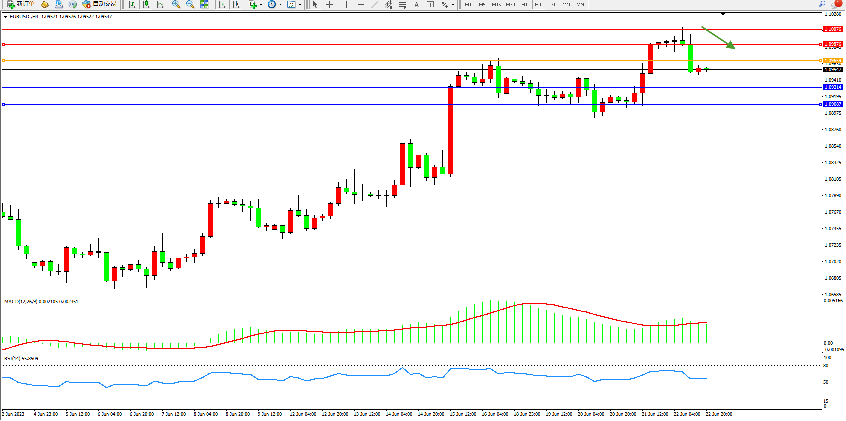 欧元美元EURUSD—4小时K线图显示: