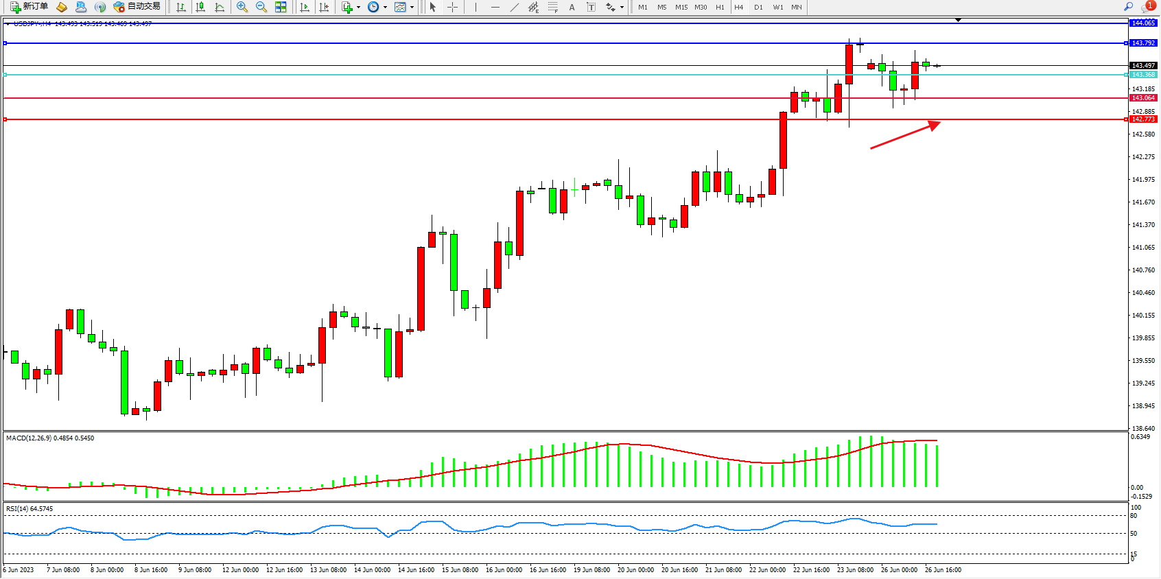 交易策略:143.368上方看涨,目标143.792 144.065