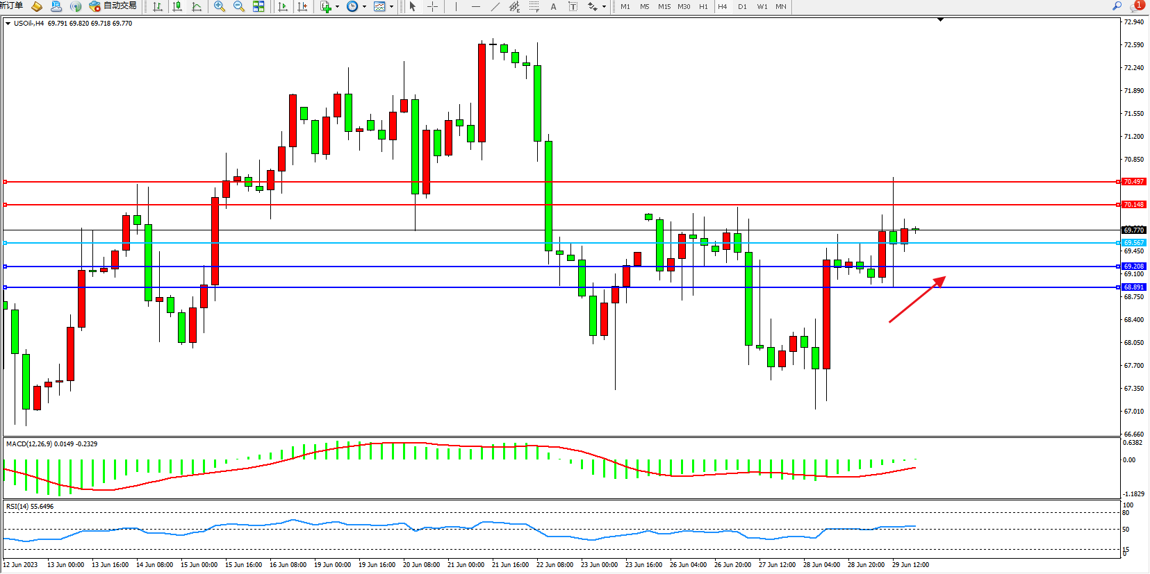 原油USOil——4小时K线图显示: