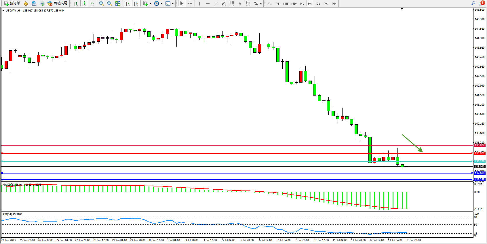4小时图看:市场空头情绪逐渐下行后低位弱势徘徊,短期跌势缓慢止步后有继续向下移动态势,MACD指标处于空头区域低位弱势整理,RSI指标处于低位弱势徘徊;