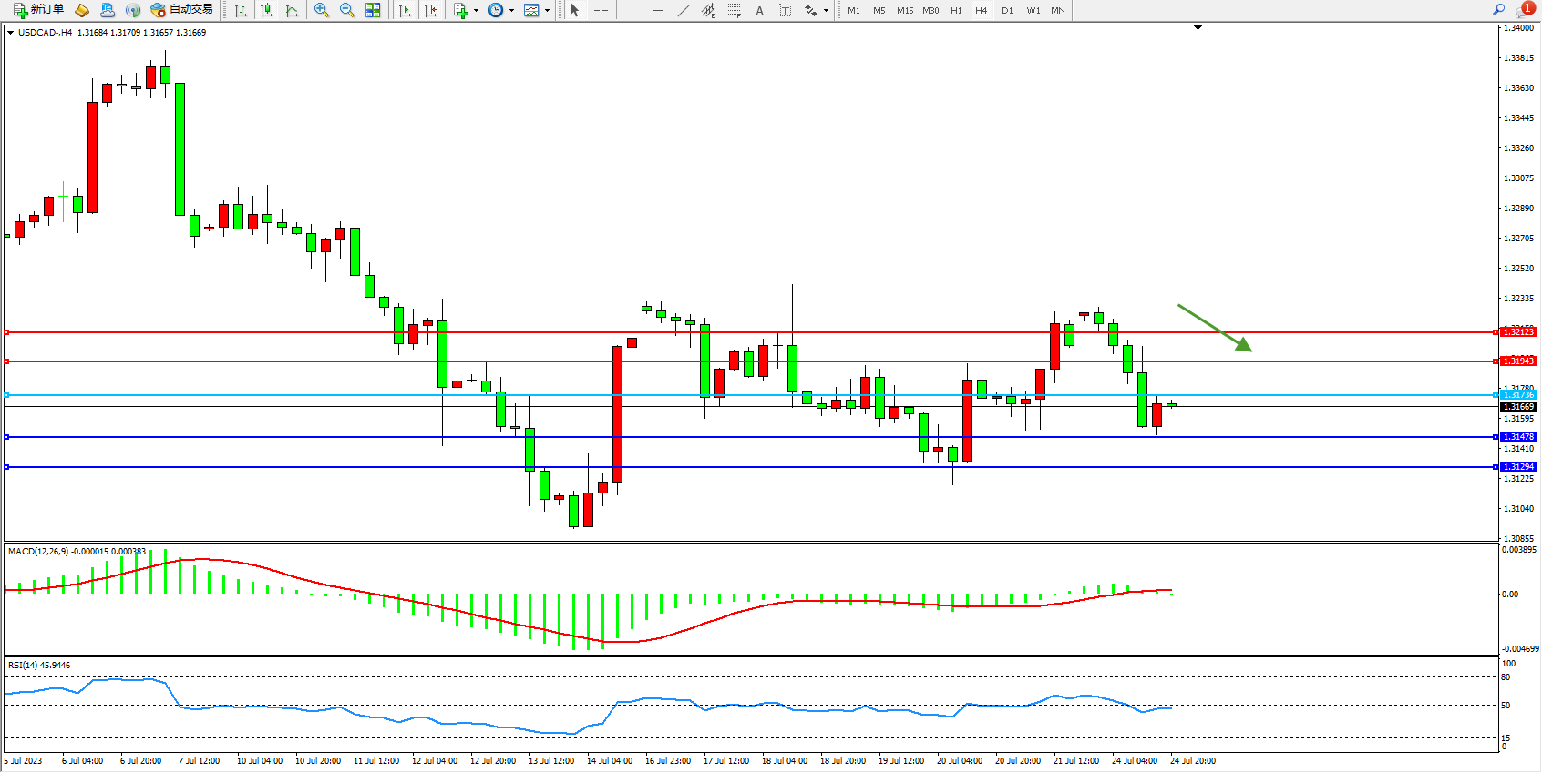 4小时图看:市场空头情绪笼罩,短期有迹象继续向下移动态势,MACD指标处于0轴线附近徘徊,RSI指标处于50均衡线下侧弱势整理;