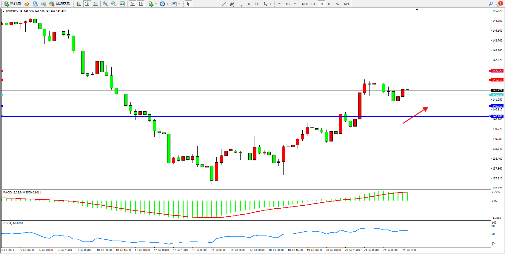 美元兑日圆维持141.471附近震荡,日本银行维持货币宽松政策和鸽派立场,以推升通胀水平,尤其是工资通胀。预计日本央行在本月会议仍将维持极宽松的货币政策,因为日本银行行长植田和男早前表示,当前与实现2%的通胀目标仍有一段距离。
