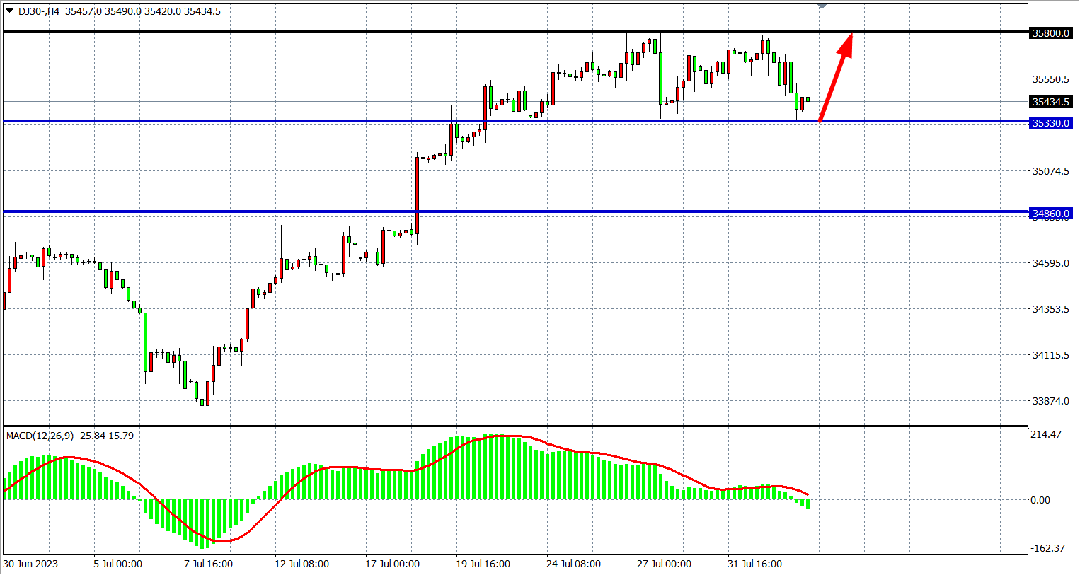 4小时图看,道指在高位35800受阻回落,同时在35330附近受支撑,MACD量能在零轴上缩量,行情进入高位盘整,支撑关注35330-35100附近,阻力35800-36000。