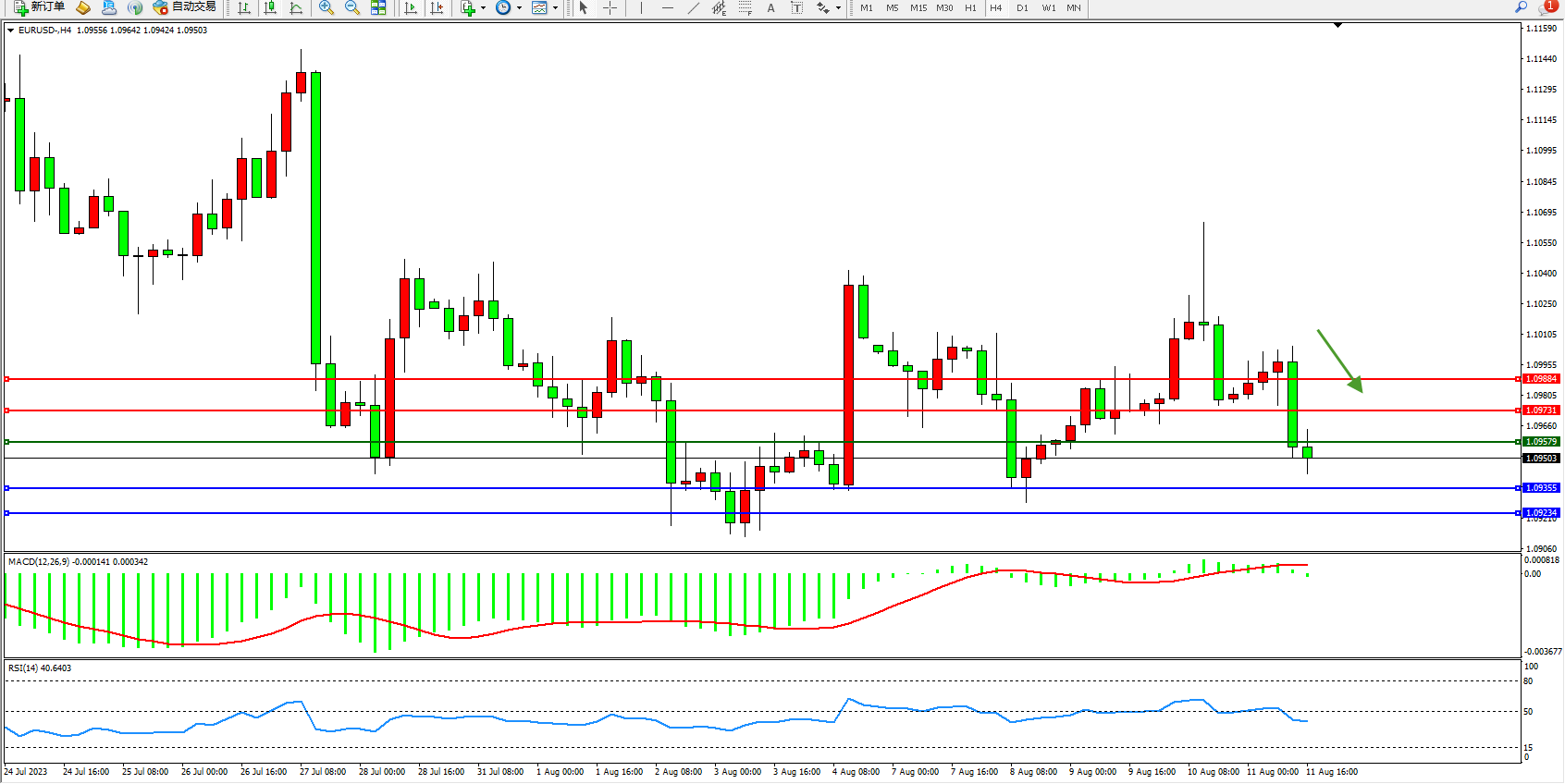 欧元美元EURUSD—4小时K线图显示: