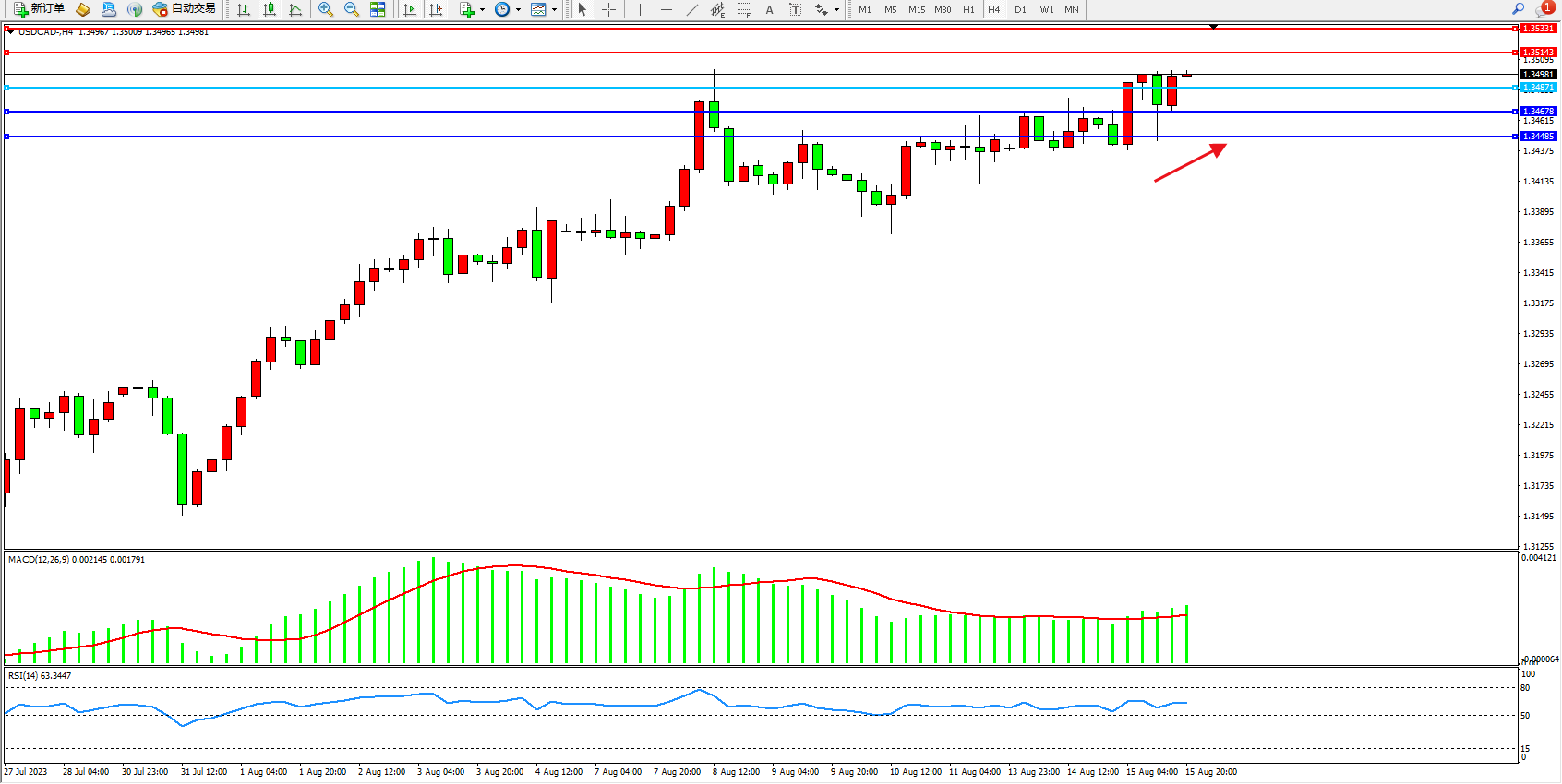 美元加元USDCAD——4小时K线图显示: