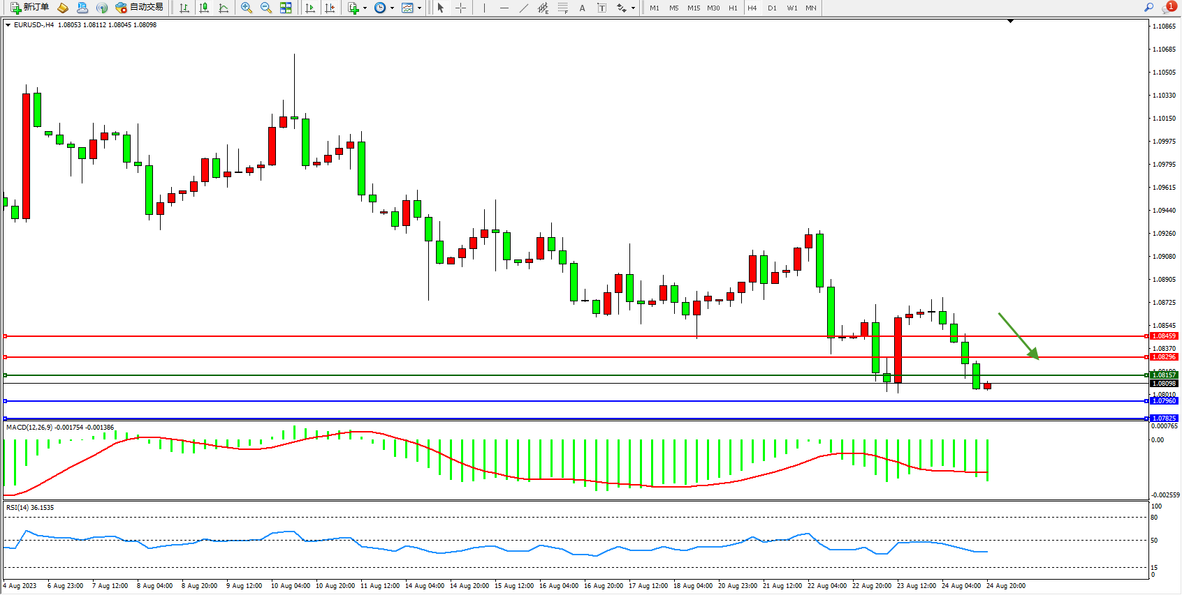 欧元美元EURUSD—4小时K线图显示:
