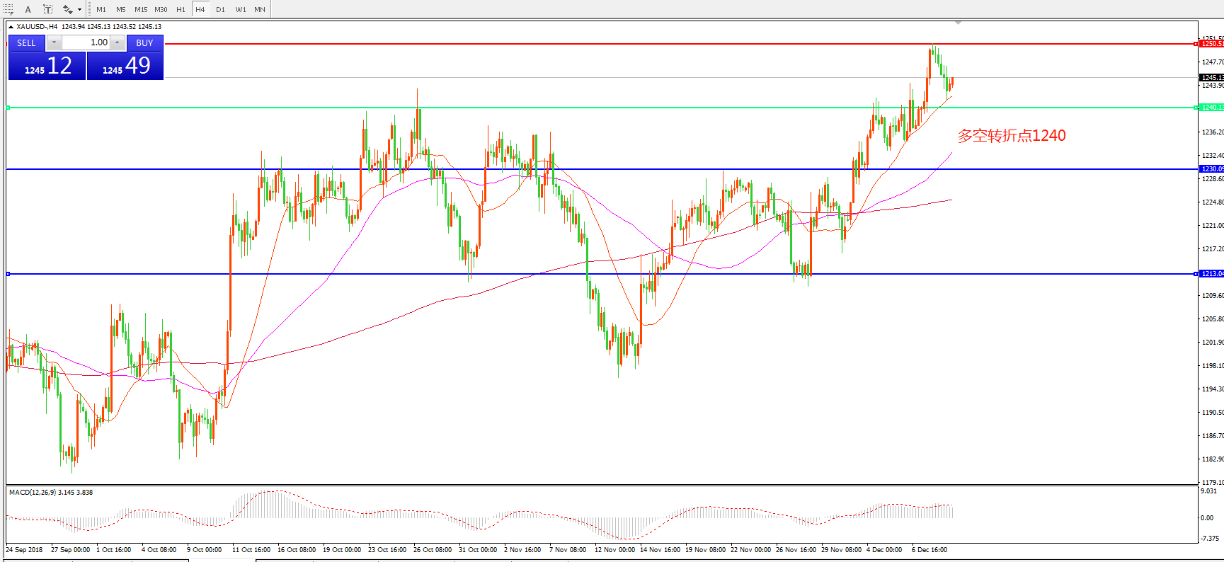 4小时图看,黄金短期受制于1250一线阻力回落,但依然处于多头形态之中,1240支撑有效, MACD红柱增加,短期回落后依然以逢低做多思路对待。