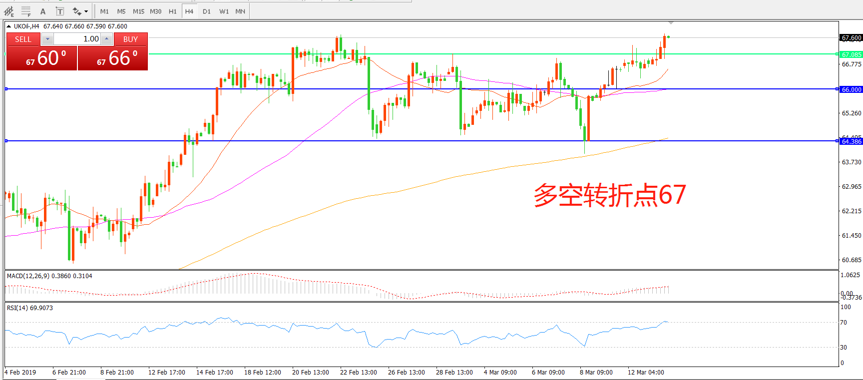 4小时图看,油价触及200周期均线附近连续反弹,昨日强势突破前期阻力67一线阻力,短期走势偏强,均线系统呈多头排列,MACD红柱增加,RSI指标向上,日内震荡上行概率较大