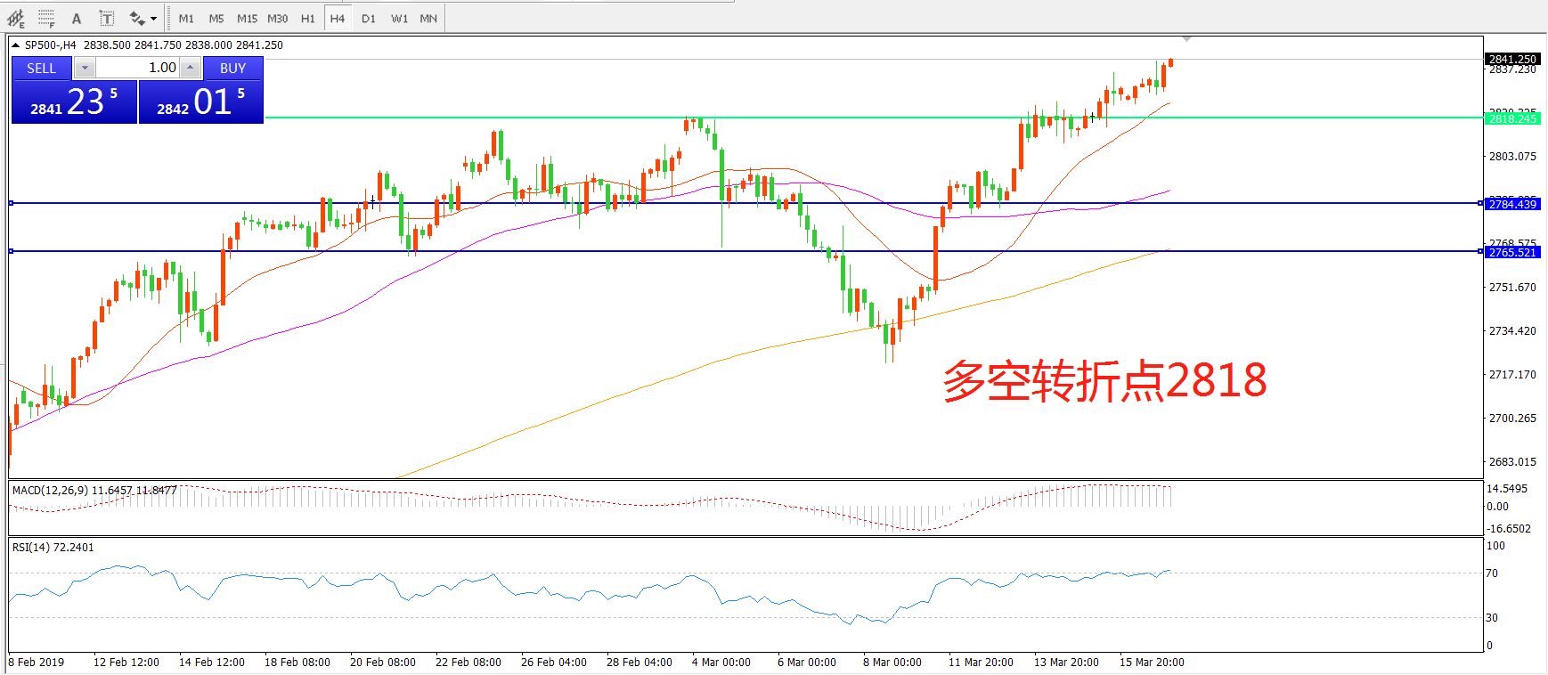 4小时图看,标普500突破2818一线后,持续出现反弹,整体走势偏强。均线系统呈多头排列,MACD红柱增加,RSI指标掉头上,日内延续上行概率较大。
