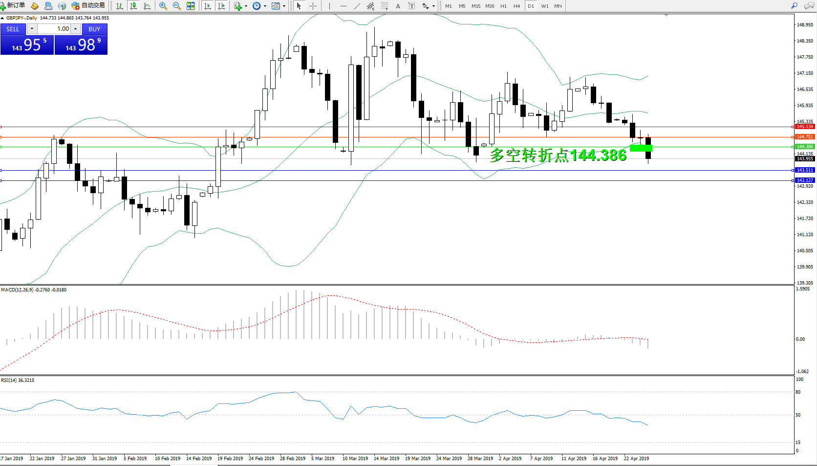 交易策略:144.386下方看跌,目标143.511、143.127