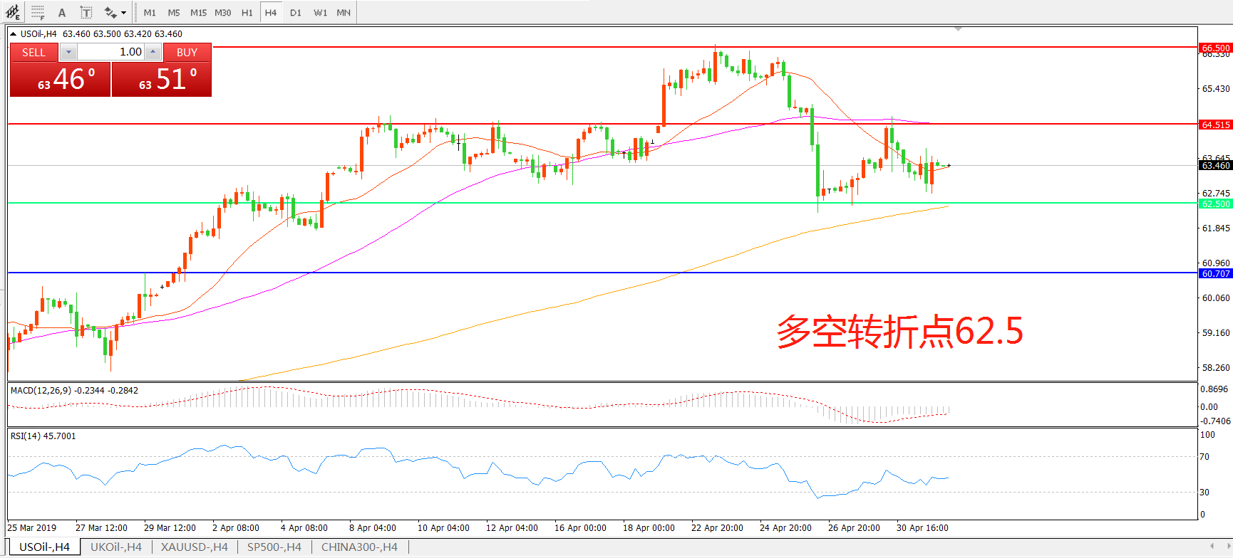 美国能源信息署周三(5月1日)公布报告显示,截至4月26日当周,美国EIA原油库存增加993.4万桶,利空油价,但委内瑞拉动荡局势加剧以及美国加大伊朗制裁力度部分限制了油价的下行空间,油价呈现宽幅震荡走势,美国WTI原油小幅收跌,报63.46美元/桶.