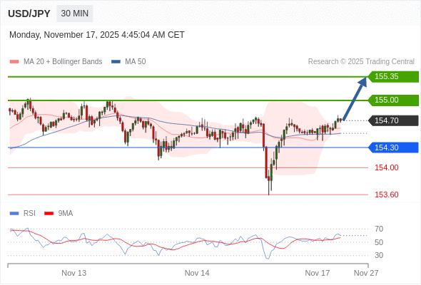 在 154.30 之上,看涨,目标价位为 155.00 ,然后为 155.35 。