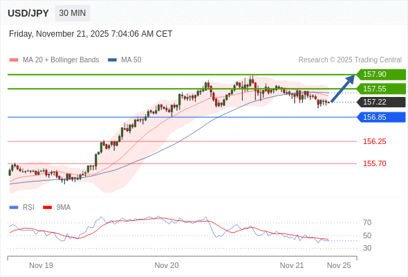 在 156.85 之上,看涨,目标价位为 157.55 ,然后为 157.90 。