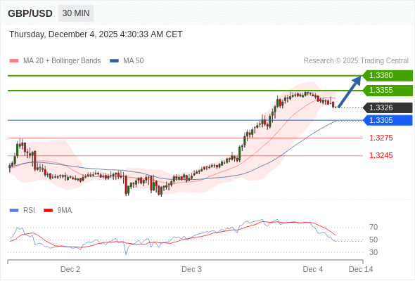 在 1.3305 之上,看涨,目标价位为 1.3355 ,然后为 1.3380 。
