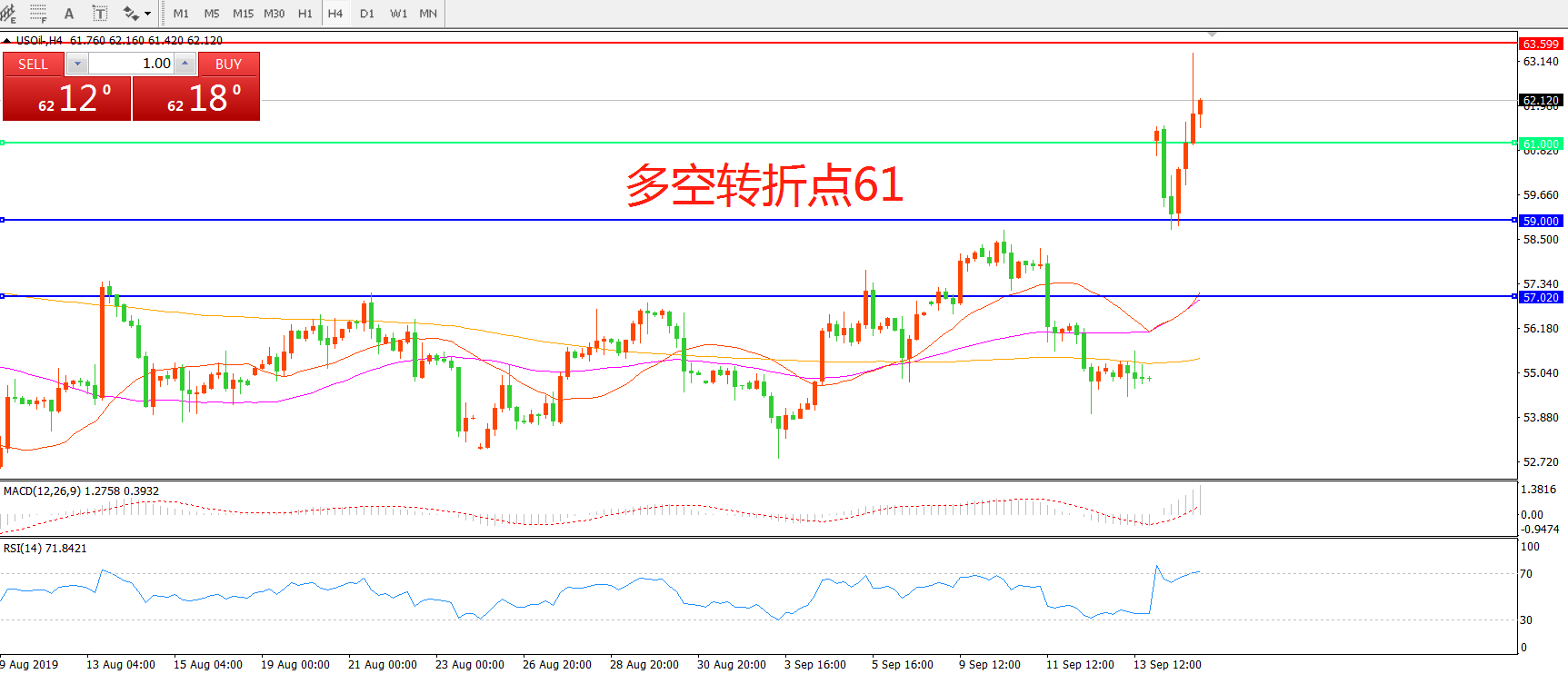周六沙特最大原油设施遭无人机袭击,导致逾500万桶/日产能暂停,受影响的产油量占沙特当前产油量的一半,美油周一收盘暴涨12.82%,报62.15美元/桶,创下2008年12月以来的最大单日涨幅。供应危机和中东地区可能会陷入战争的担忧引爆了市场中的避险情绪。
