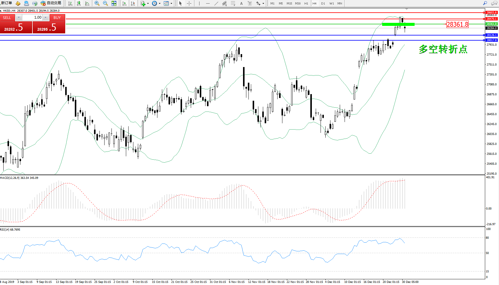 2019年最后一个交易日,恒指低开低走,截至收盘跌0.46%,报28189.75点;2019年全年累涨约9%,港股跟随外围低开77点,港股早上跟随外围低开77点,曾跟A股造好而收窄跌幅至仅20点,唯沽压略重,再度扩大跌幅,恒指低见28123。恒指昨日继续维持上行态势,成交量也有所放大,暗示市场投资情绪持续偏向积极。但恒指尾盘出现小幅回落,体现再度上行的压力仍存,而近期消息面也较为淡静。恒指已经累涨四周,目前已处于相对高位,从历史表现来看,这个时候是可能会出现一定的回调的。因为资本是逐利的,这一点从隔夜美股获利回吐的表现也得到印证。这样的表现并不意味着变盘,而更多的可能是应对利率调整、以及适应股市的乐观情绪,为后市的发展奠定基础。