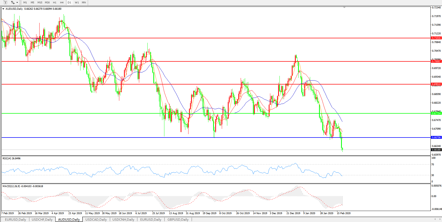 澳元兑美元周四在澳洲就业数据意外逊色的影响下跌至0.6630新低,失守本月初的低点0.6660,为2009年3月以来的近11年新低。日内澳洲意外低迷的就业数据显然是导火索,并引燃了投资者对于该国经济更深的忧虑; 此前,澳洲境内多地连绵的森林大火,显然影响了其国内多个行业的开工水平,然而祸不单行,全球公共卫生风波再度令该国的旅游业损失惨重,并且其出口行业也因为国际产业链受创的状况而遭到重击。投资者因此拒绝看好澳洲经济前景,而之后3月初下次会议上,澳洲联储的进一步宽松前景又会受到关注; 当前的澳元跌势也巩固了自2018年2月以来持续两年的下行趋势,去年底的上涨趋势被确认只是中期技术调整,因而,后市汇价在基本面配合下,尤其是澳洲联储再度降息的前景下,仍有望下探自0.65下方,2009年全球金融危机时的铁底0.60关口,亦已相去不远。