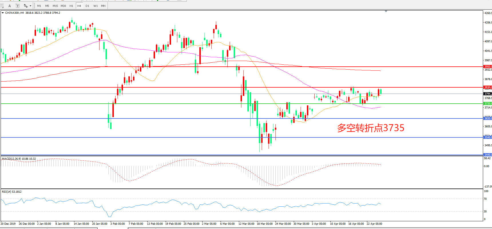 4小时图看,沪深300延续区间震荡, 3735成为短期支撑,3830成为上方支撑,均线系统走平,MACD红柱增加,RSI指标走平,日内延续震荡概率较大。