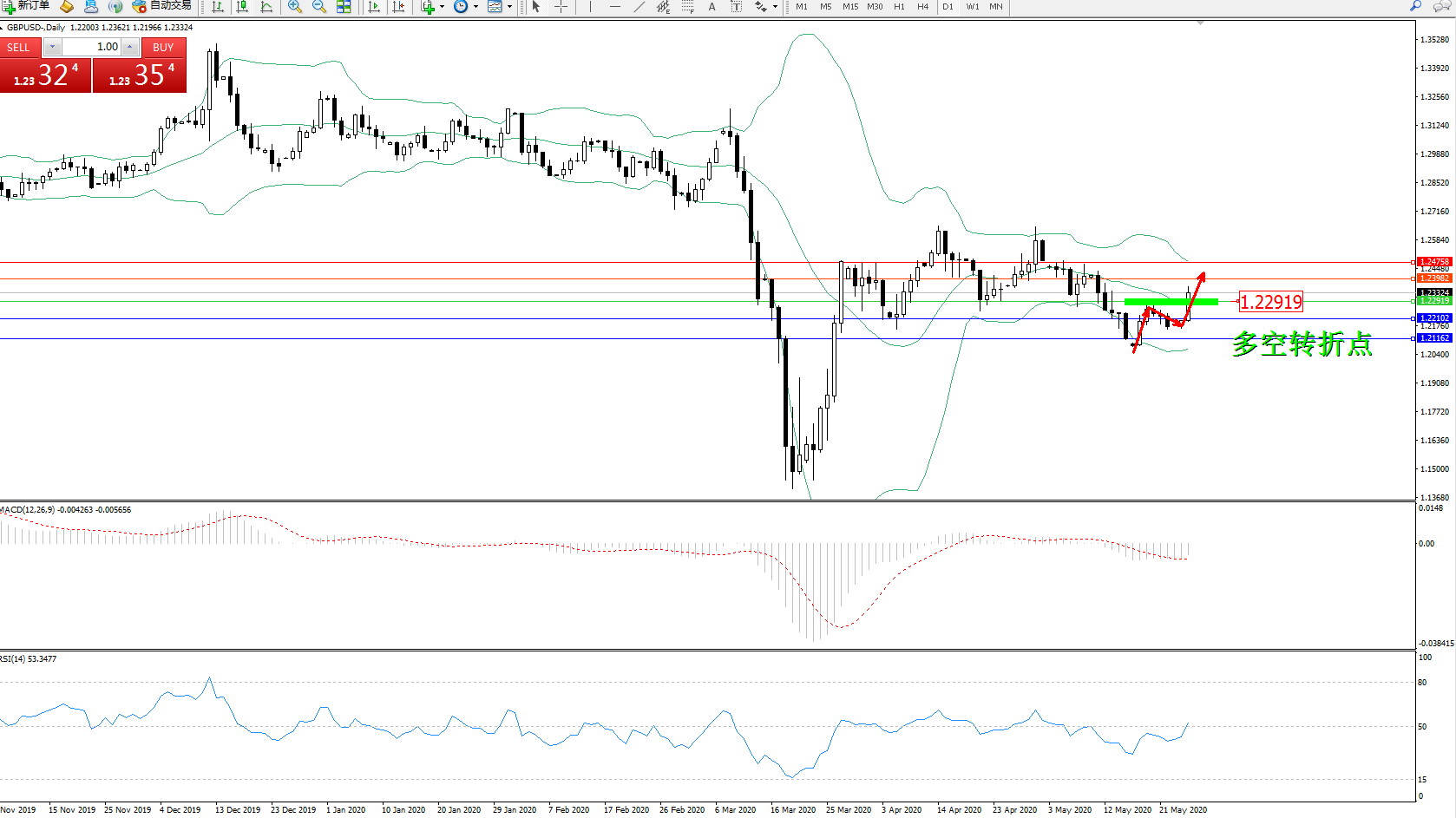 交易策略:1.22919上方看涨,目标1.23982、1.24758