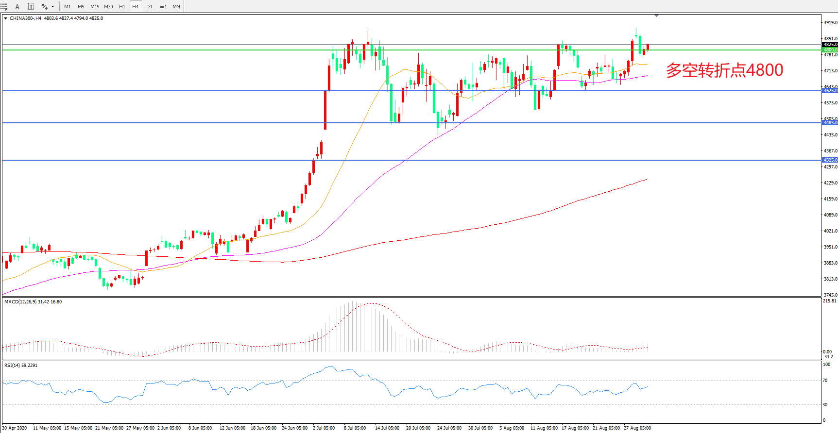 4小时图看,沪深300冲高回落,高位震荡迹象明显,4800成为多空争夺焦点,均线系统走平, MACD红柱增加,RSI指标向上,日内延续上行概率较大。