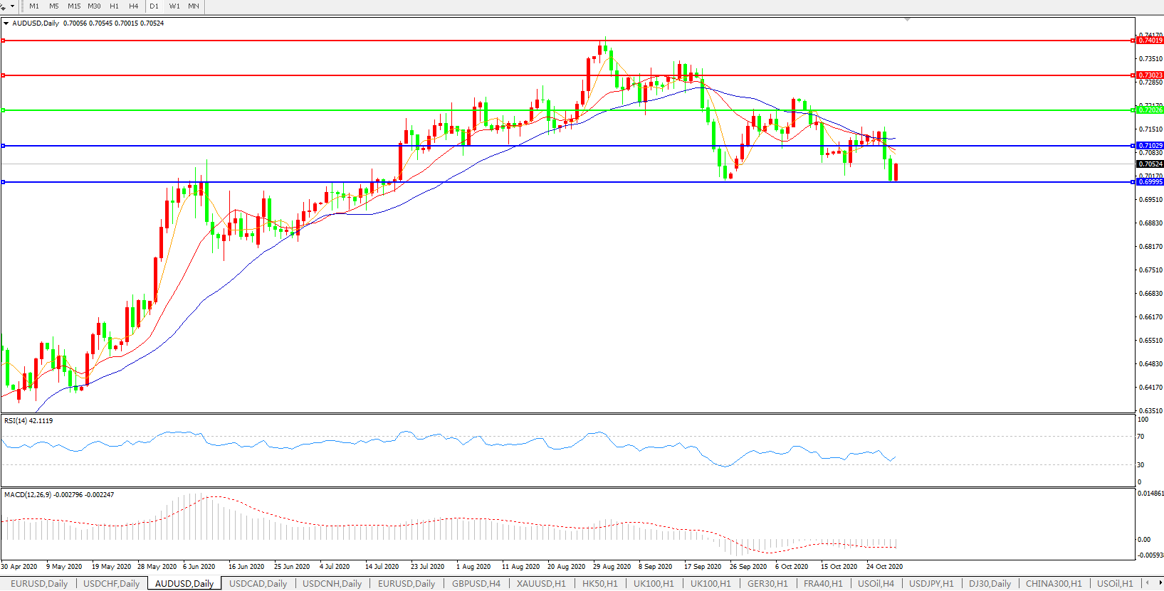澳元兑美元AUD/USD未能在市场信心提振下收复失地,正逐渐逼近0.70的整数心理关口; 在宏观经济前景黯淡之际,欧洲大陆各国延长了封锁措施,欧洲央行承诺进一步放松货币政策,均为澳元蒙上一层阴影; 澳洲联储可能调整政策及美国大选不确定性影响了风险偏好,投资者不愿将澳元推升至0.7150水平上方; 若澳洲联储意外采取鸽派立场,或推出1500-2000亿澳元的债券计划,澳元或将走高。美国大选结果不确定性则会刺激投资者抛售澳元