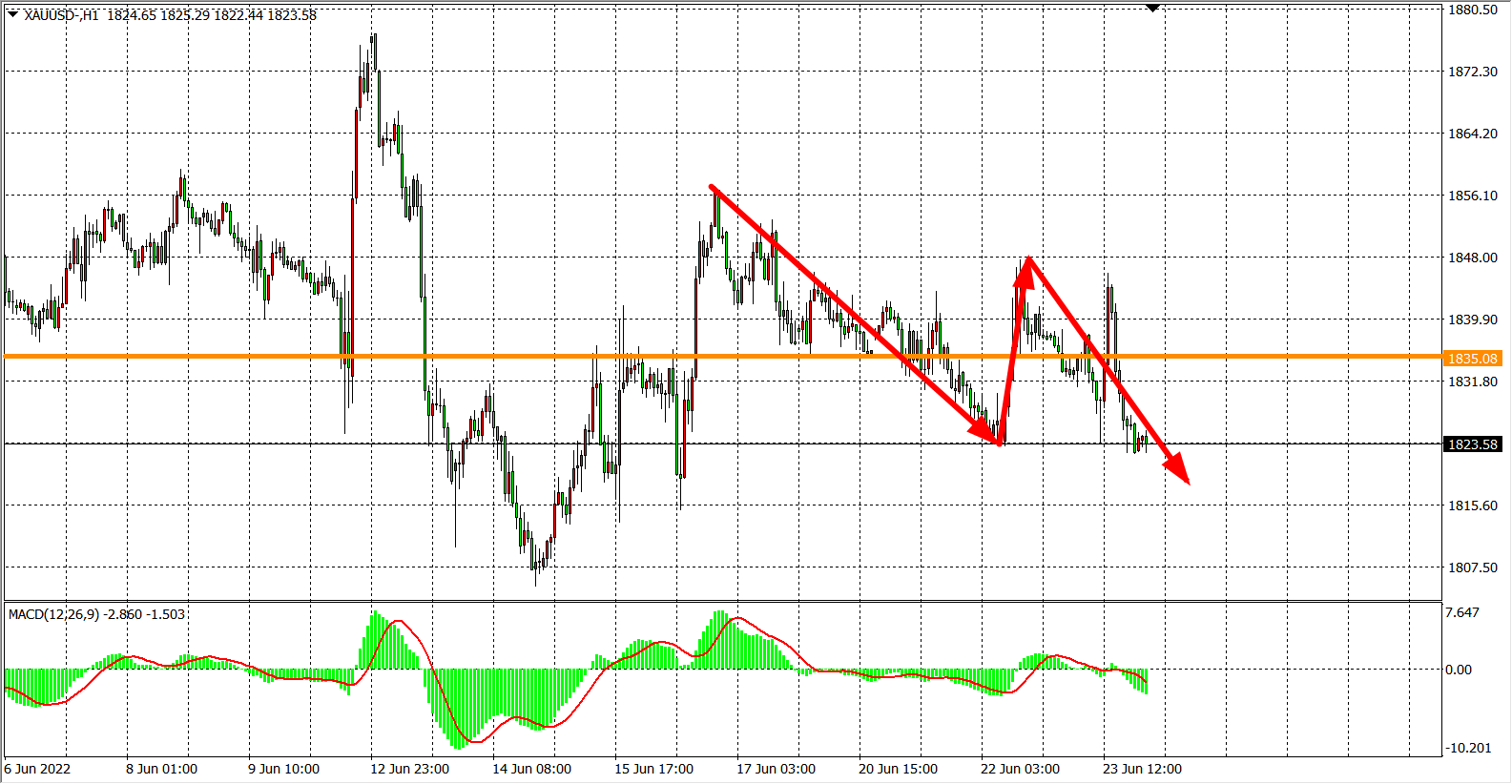 交易策略:在1835.00之下看跌,目标1815.00          1800.00